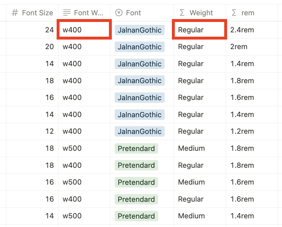 이는 정말 필요한 수식은 아니지만, 혹시 헷갈릴까봐 넣어두었다. Font Weight 속성의 값을 읽어서 텍스트 형식으로 변환해주는 수식이다. 만약 `w500`이면 `Medium`, `w400`이면 `Regular`로 변환해준다. ▼