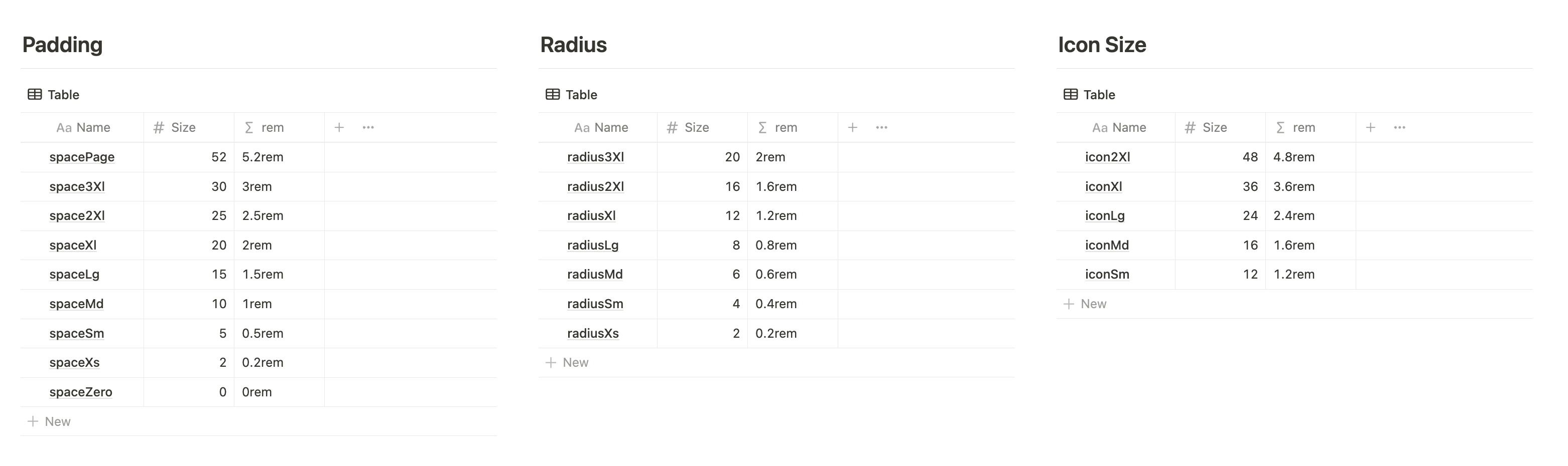 Padding, Radius, Icon Size는 아래의 이름 규칙으로 값들을 넣어두었다. ▼