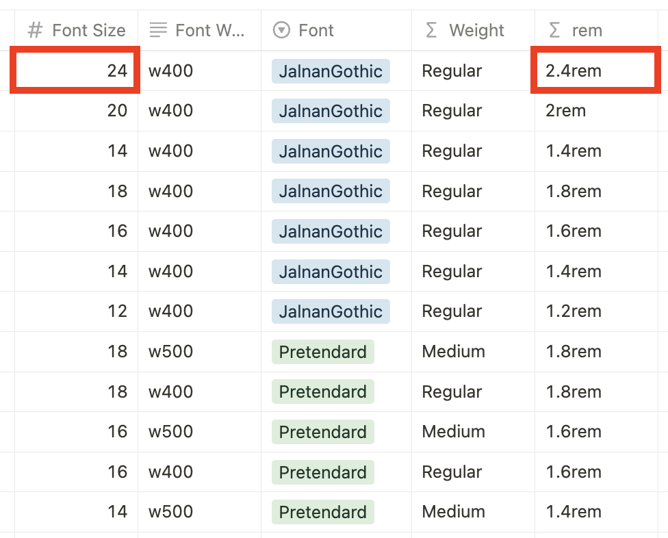 Font Size 테이블에는 `font-size`, `font-weight`, `font-family`, `rem`, `line-height` 열이 있다. 이 중에서 `line-height`의 경우 현재 프로젝트에서 사용하지 않아 빈 값으로 두었지만 언젠가 필요할 수 있을 거 같아 남겨두었다. 프로젝트에 필요한 요소들을 정의해두었고 보기 좋게 태그와 수식을 사용했다.