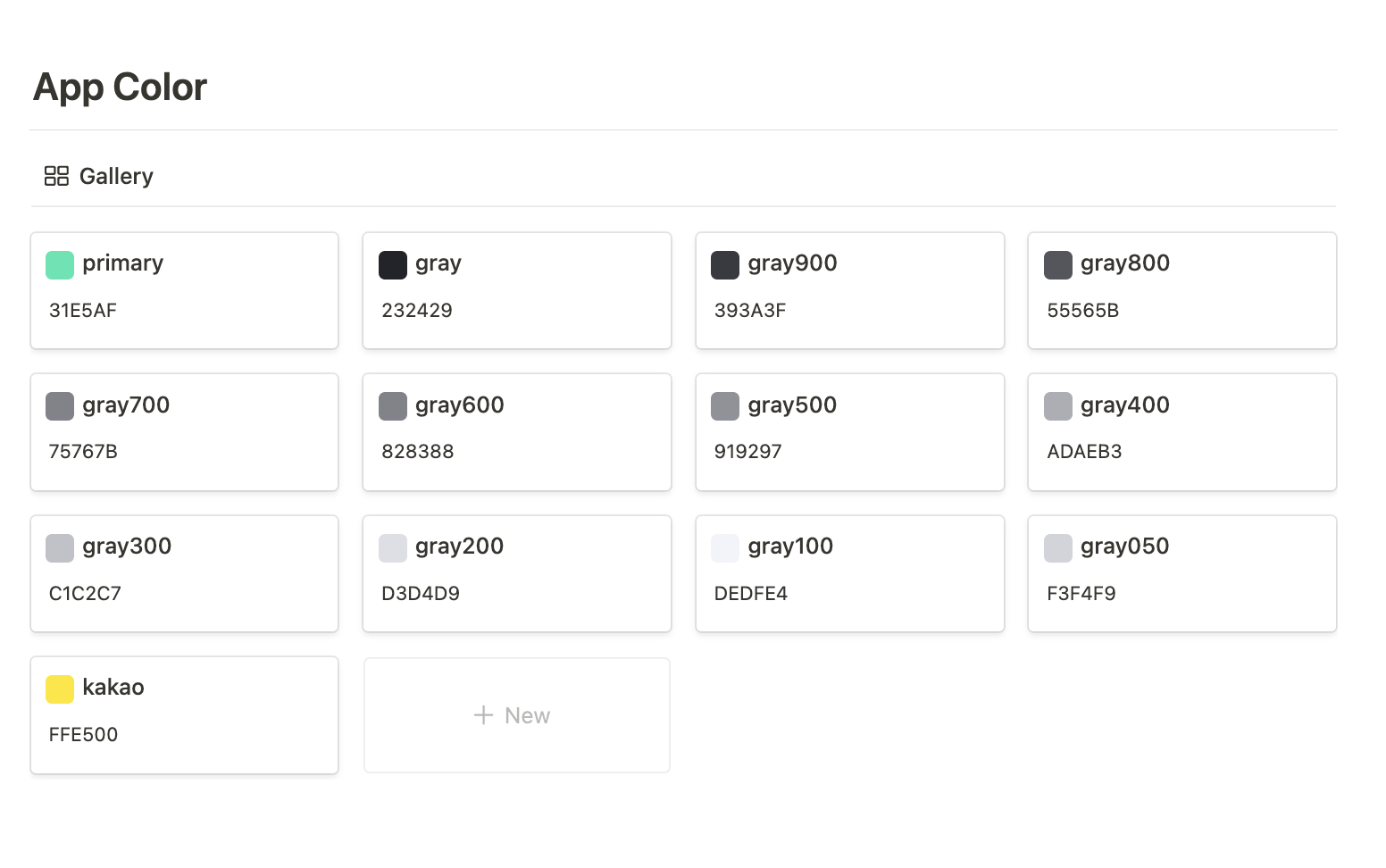 노션에는 컬러 팔레트 기능이 없다. 색 채우기를 한 100 * 100 이미지를 피그마에서 가져와 넣었다. 색상이 몇 개 안되어 금방 가져다가 넣을 수 있어 한 10분 시간내어 넣었다. 약간은 귀찮은 과정이 될 수 있는데, 이렇게 색을 미리 넣어놓으면 gray500, gray400과 같은 색이 어떤 색을 나타내는지 알기가 쉬워진다. VS코드에 기본 기능으로 색상 팔레트 기능이 추가되긴 했지만, Styled-Component를 사용할 때 백틱 안에 넣은 색상 코드들은 볼 수 가 없어서 노션에서라도 볼 수 있게 추가했다. ▼