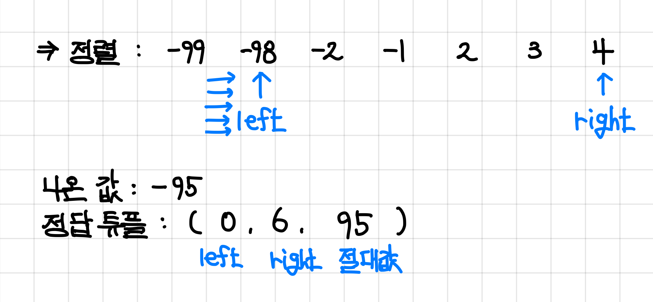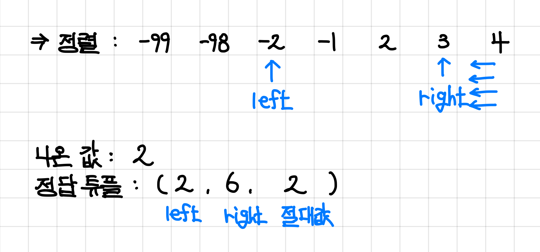 그리고 두 개의 포인터를 이용하는데, 하나는 왼쪽 맨 끝인 음수 영역, 다른 하나는 오른쪽 맨 끝인 양수 영역에 놓고 값을 더해보면 된다.