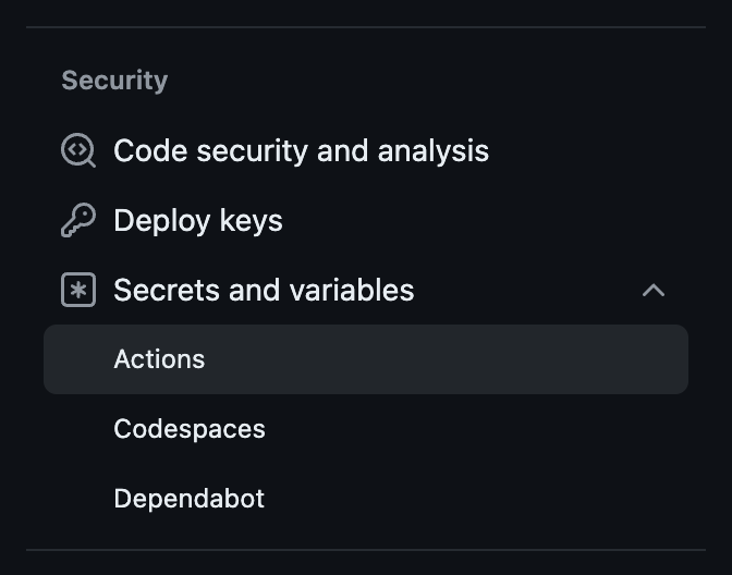 다음으로는 Secrets를 통해 .env에 있는 값과 firebase 키를 넣어주었다. 레포지토리 세팅에 들어가면 Security 항목에 Secrets and variables라는 탭이 있는데, 여기서 Actions로 들어가면 secret 키를 넣을 수 있다. ▼