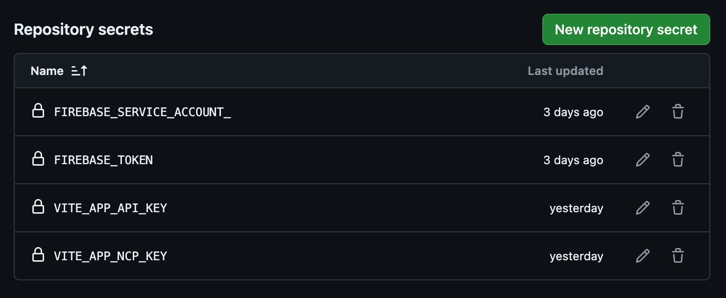나는 우선 네이버 지도 API도 사용하고 있기에 아래와 같이 키들을 넣어주었다. 이 키들은 뒤에 설정할 Github Action에서 사용하게 된다. ▼