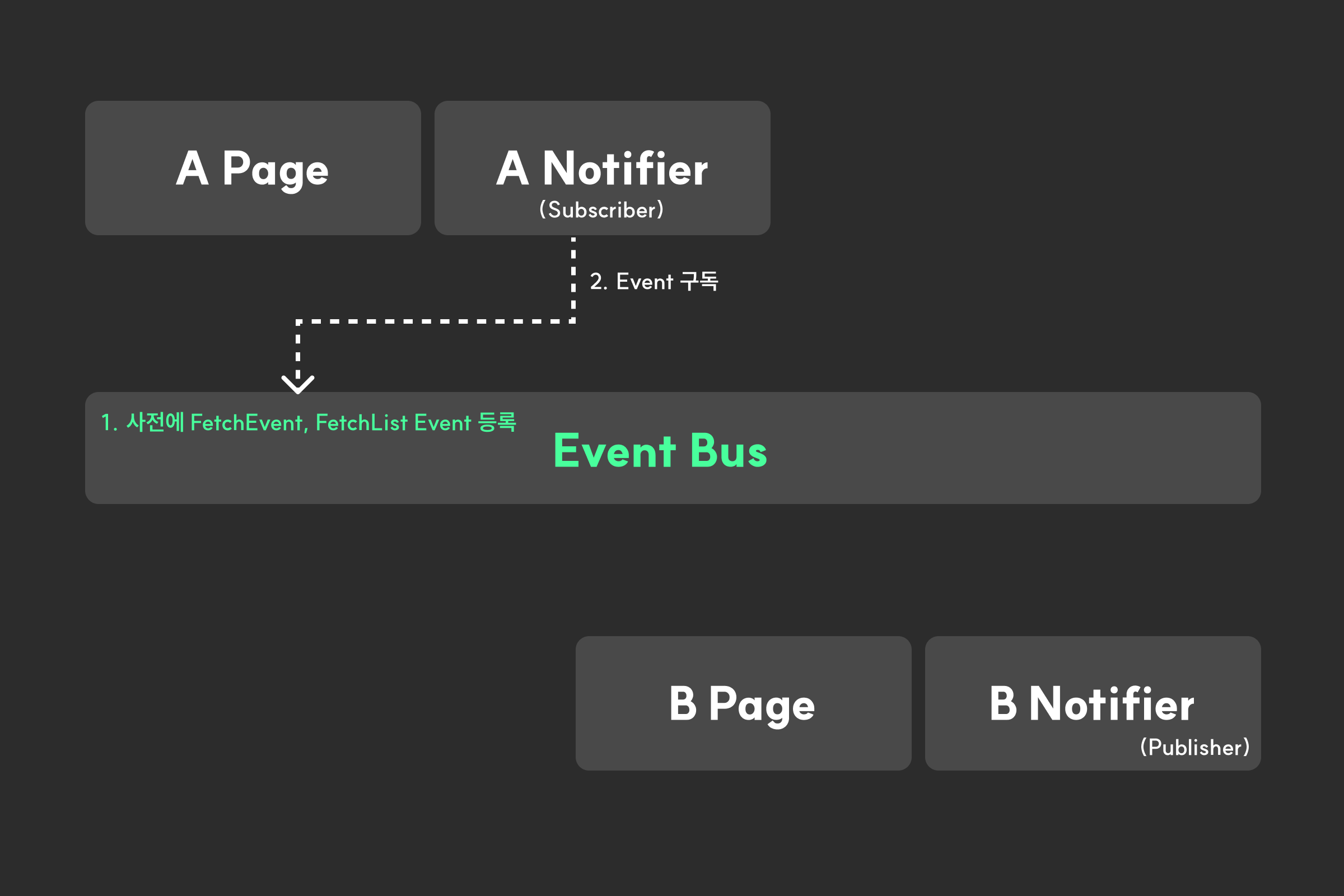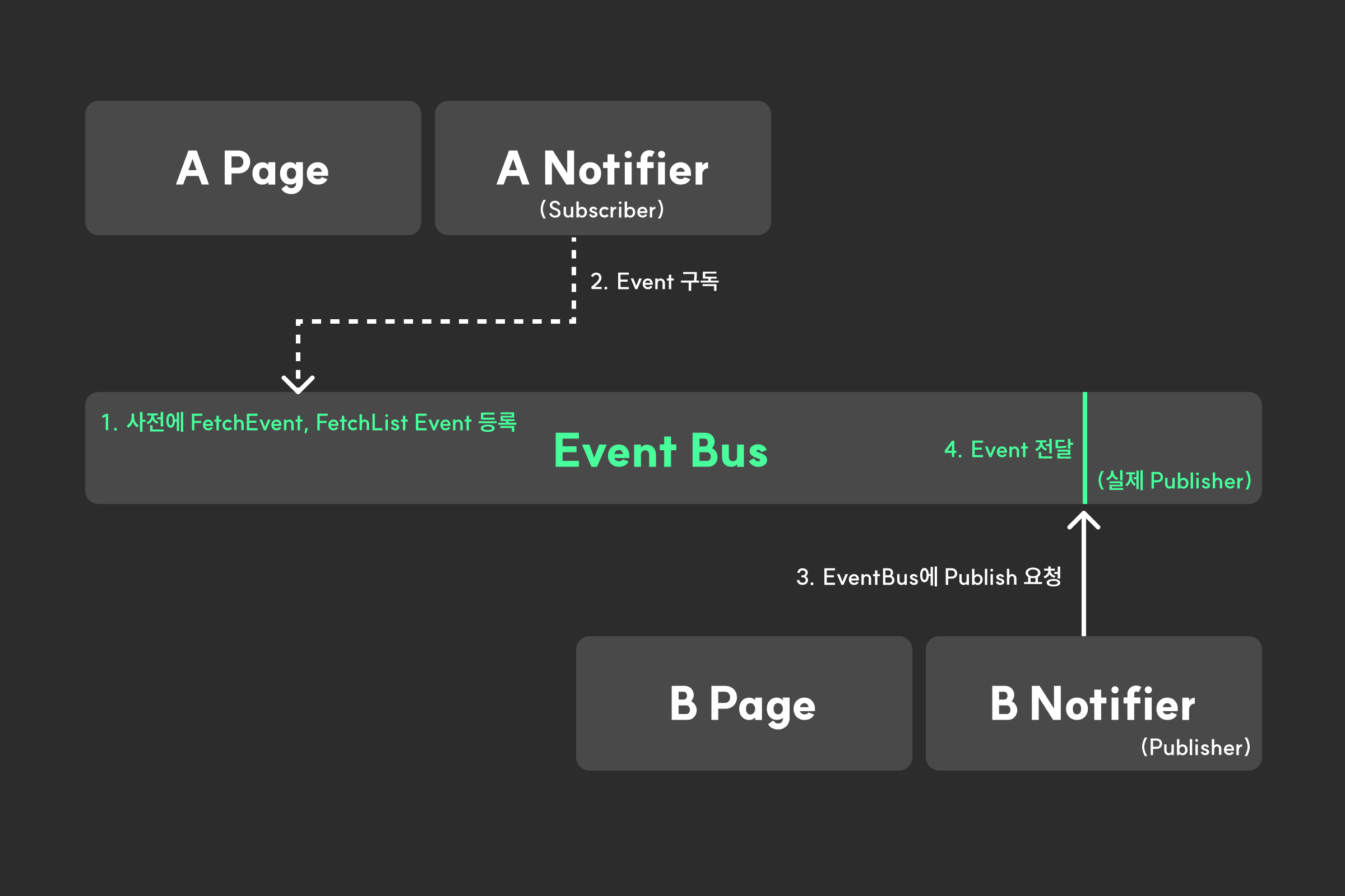 예를 들어, B에서 A로 돌아가는 시점에서 이벤트 발행자가 데이터를 다시 패칭하라는 이벤트를 발행했다면, 이벤트 버스가 이를 받아서 A에 전달해준다. ▼