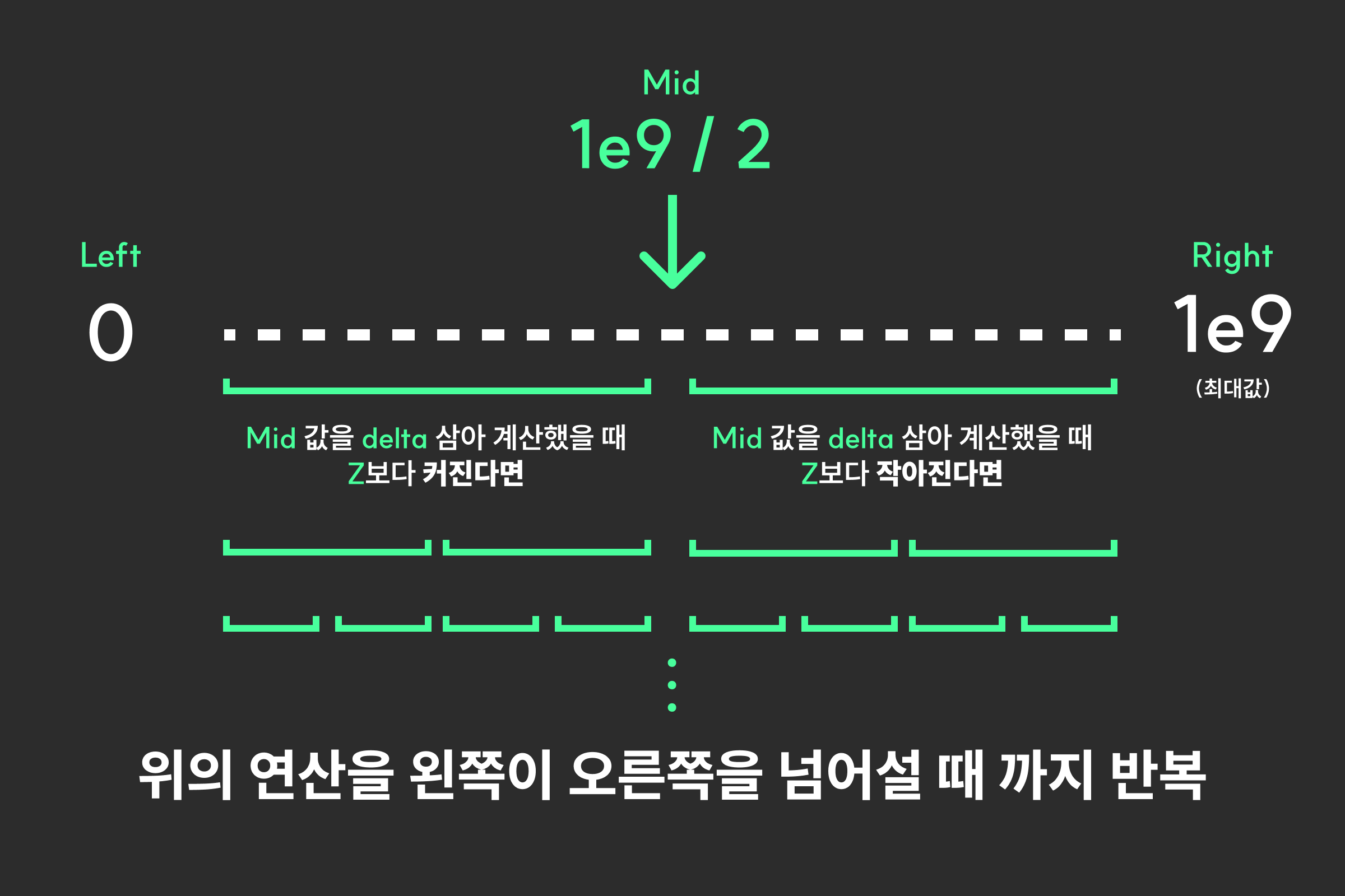 필자는 최대한 빠르게 연산을 하고자 `X - Y`를 최대값으로 두었는데, `delta`가 이보다 커지는 경우가 존재했다. 그래서 어떤 범위가 정말 최적인지를 고민하다 그냥 최대값으로 두는게 속이 편해 1e9로 두었다.