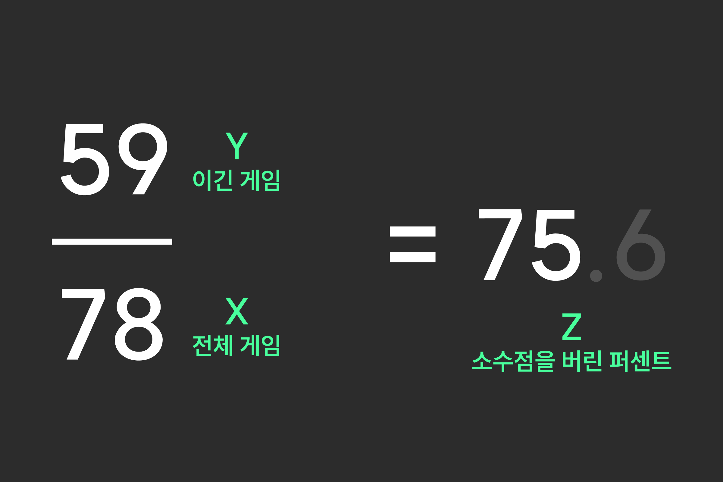 이긴 게임 Y와 전체 게임 X가 들어왔을 때, 소수점을 버린 퍼센트가 Z이다. ▼