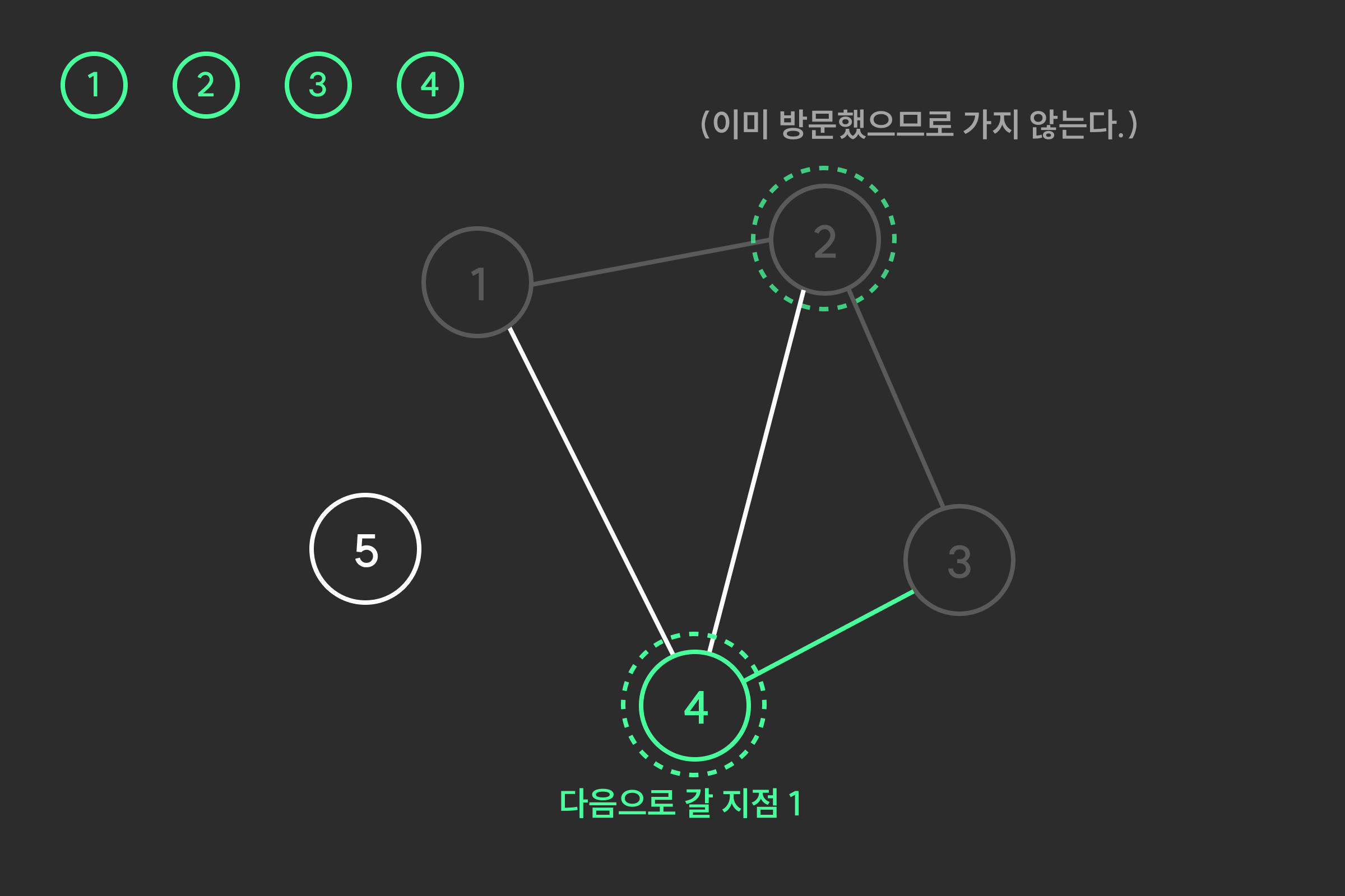 2번과 4번이 있으나 2번은 이미 방문을 했으니 4번 정점으로 향한다. ▼