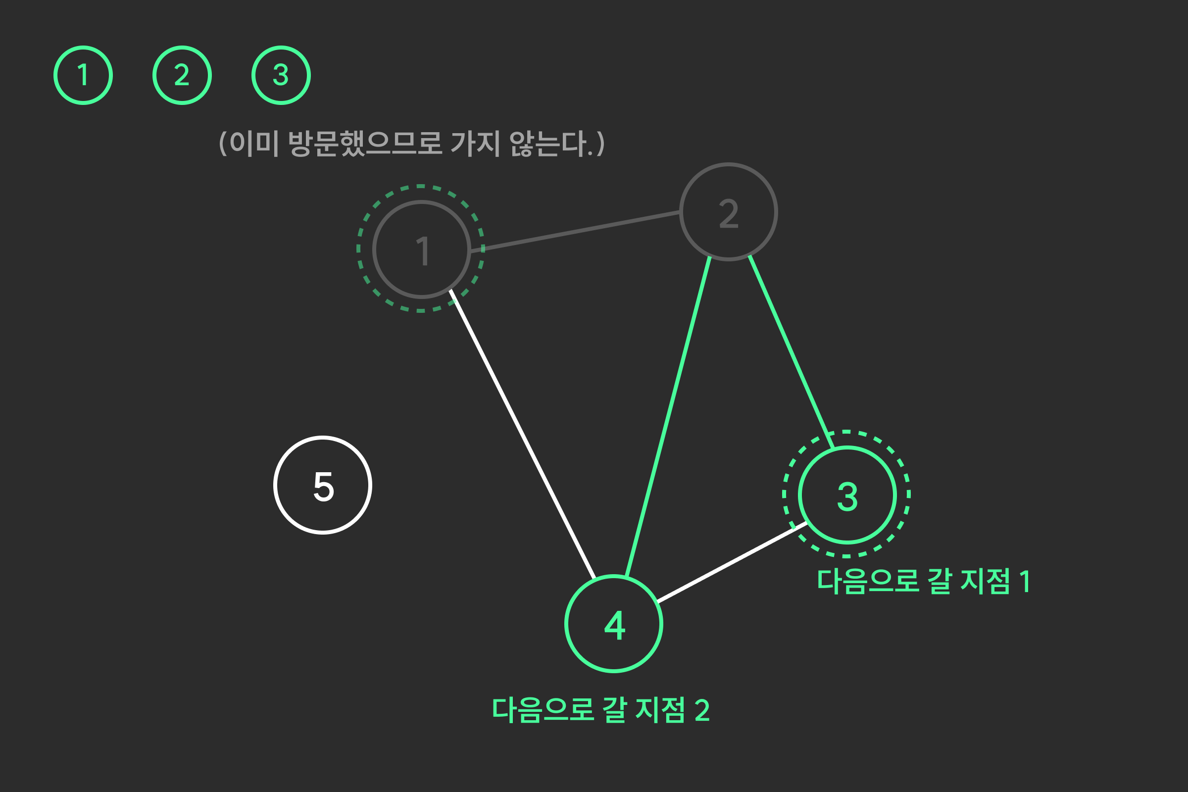 똑같이 2번도 방문했다고 체크를 해두고, 갈 수 있는 다음 정점들을 찾아본다.