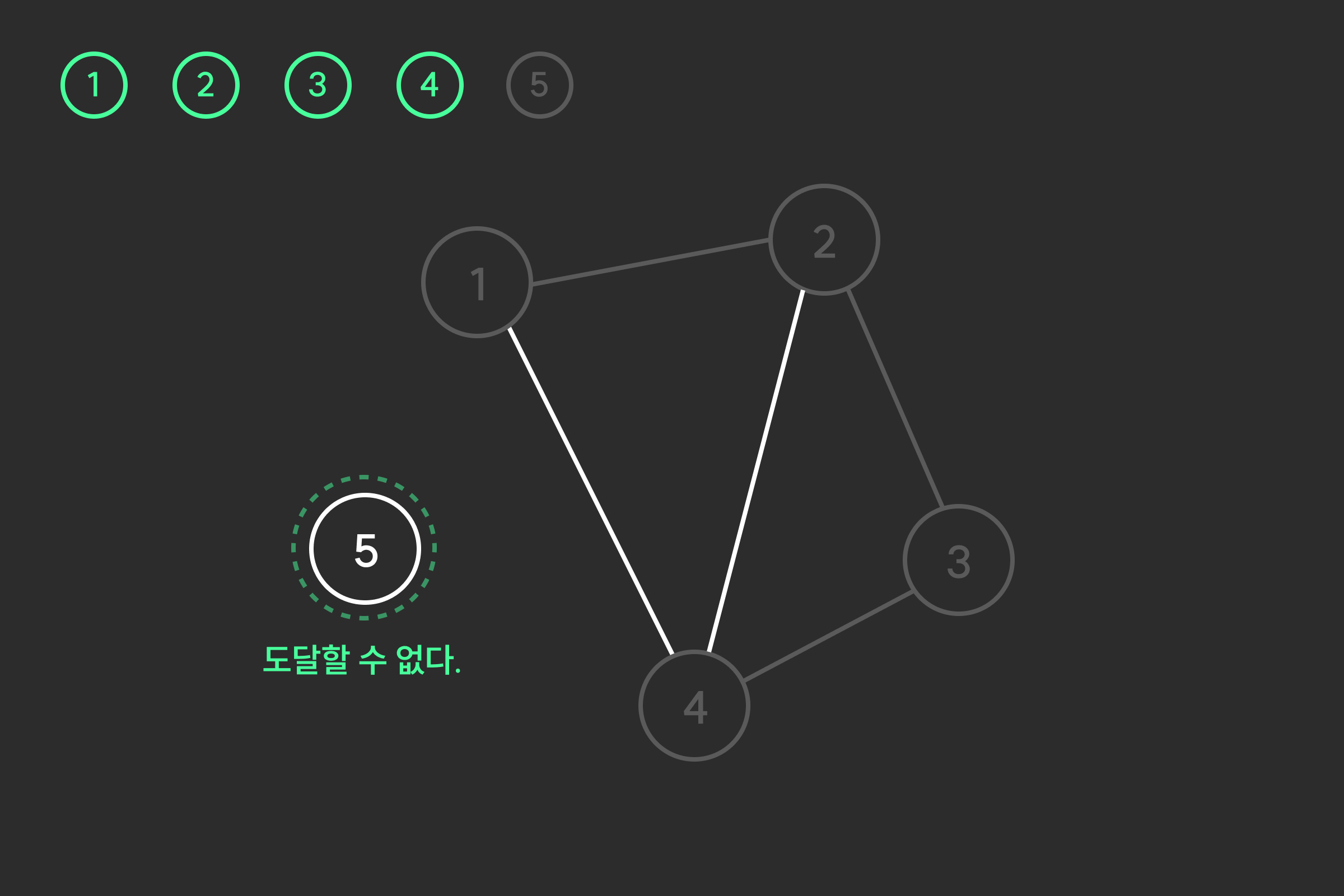 이제 모두 방문을 했으니 더 이상 갈 수 없어져 탐색이 종료되고, 5번은 갈 수 없는 것으로 결론을 내린다. ▼