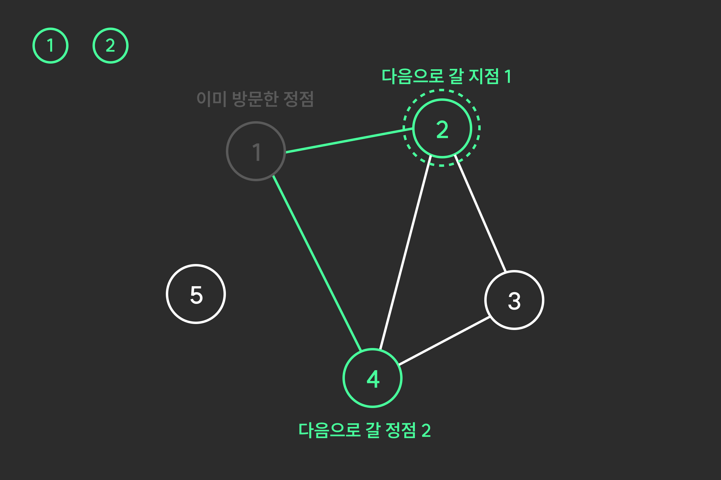 똑같이 2번도 방문했다고 체크를 해두고, 갈 수 있는 다음 정점들을 찾아본다.