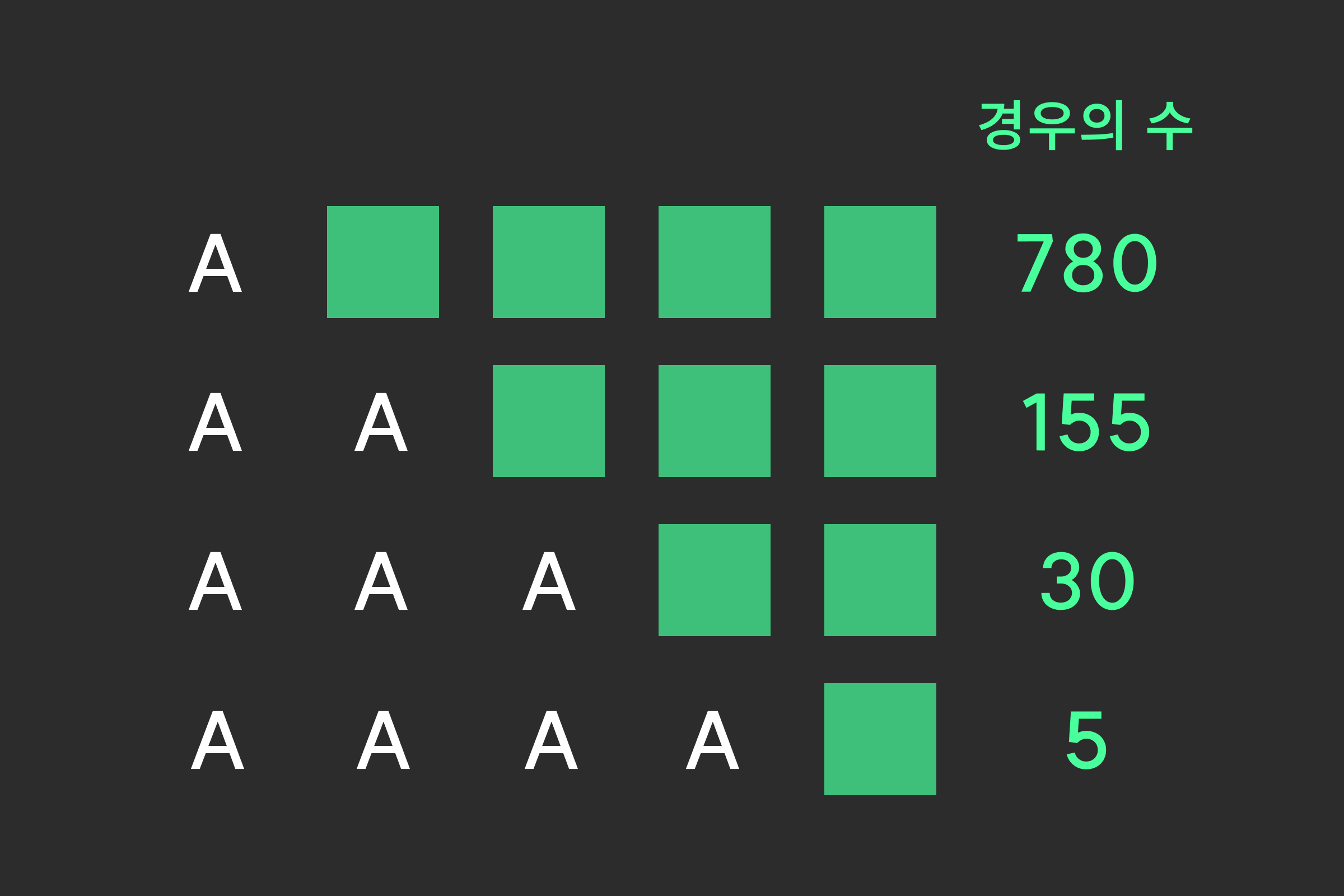 4자리일 때는 780, 3자리일 때는 155, 2자리일 때는 30, 1자리일 때는 5가지가 나온다.