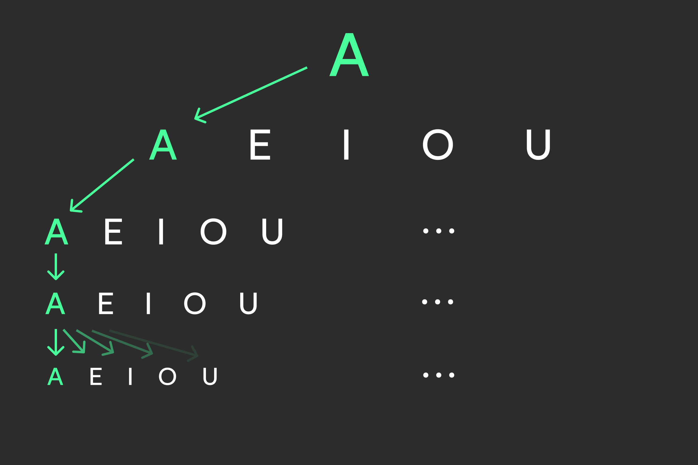 DFS로 푸는 방법은 깊이를 하나씩 늘려가며 사전을 전부 만드는 것이다.