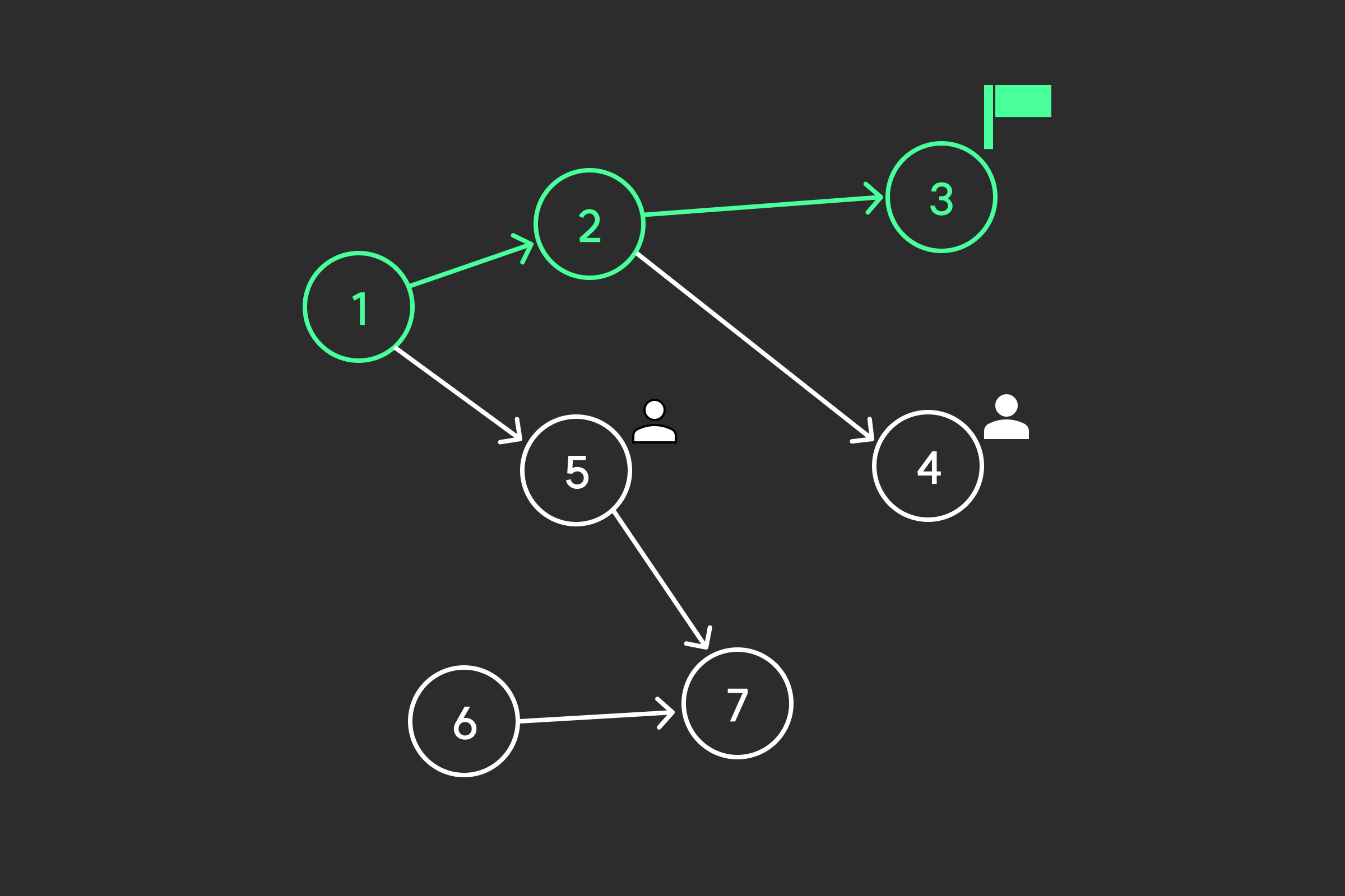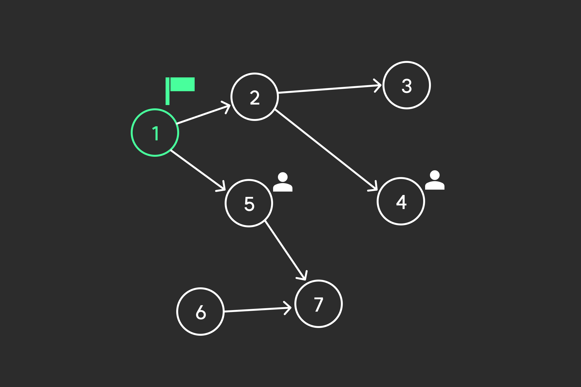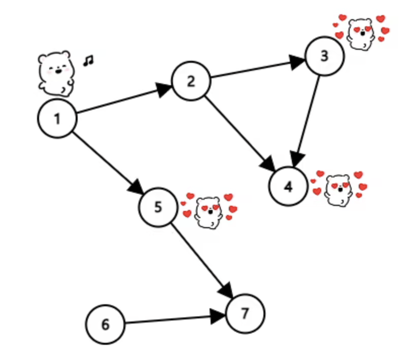 투어리스트 곰곰이는 종종 이 그래프 위에서 여행을 떠난다. 투어리스트 곰곰이의 여행은 1번 정점에서 출발해 간선을 따라서 이동한다. 그러다가 더 이상 간선을 따라서 이동할 수 없는 경우 투어리스트의 여행은 종료된다.