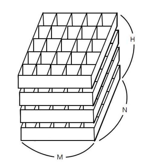 첫 줄에는 상자의 크기를 나타내는 두 정수 M,N과 쌓아올려지는 상자의 수를 나타내는 H가 주어진다. M은 상자의 가로 칸의 수, N은 상자의 세로 칸의 수를 나타낸다. 단, 2 ≤ M ≤ 100, 2 ≤ N ≤ 100, 1 ≤ H ≤ 100 이다. 둘째 줄부터는 가장 밑의 상자부터 가장 위의 상자까지에 저장된 토마토들의 정보가 주어진다. 즉, 둘째 줄부터 N개의 줄에는 하나의 상자에 담긴 토마토의 정보가 주어진다. 각 줄에는 상자 가로줄에 들어있는 토마토들의 상태가 M개의 정수로 주어진다. 정수 1은 익은 토마토, 정수 0 은 익지 않은 토마토, 정수 -1은 토마토가 들어있지 않은 칸을 나타낸다. 이러한 N개의 줄이 H번 반복하여 주어진다.