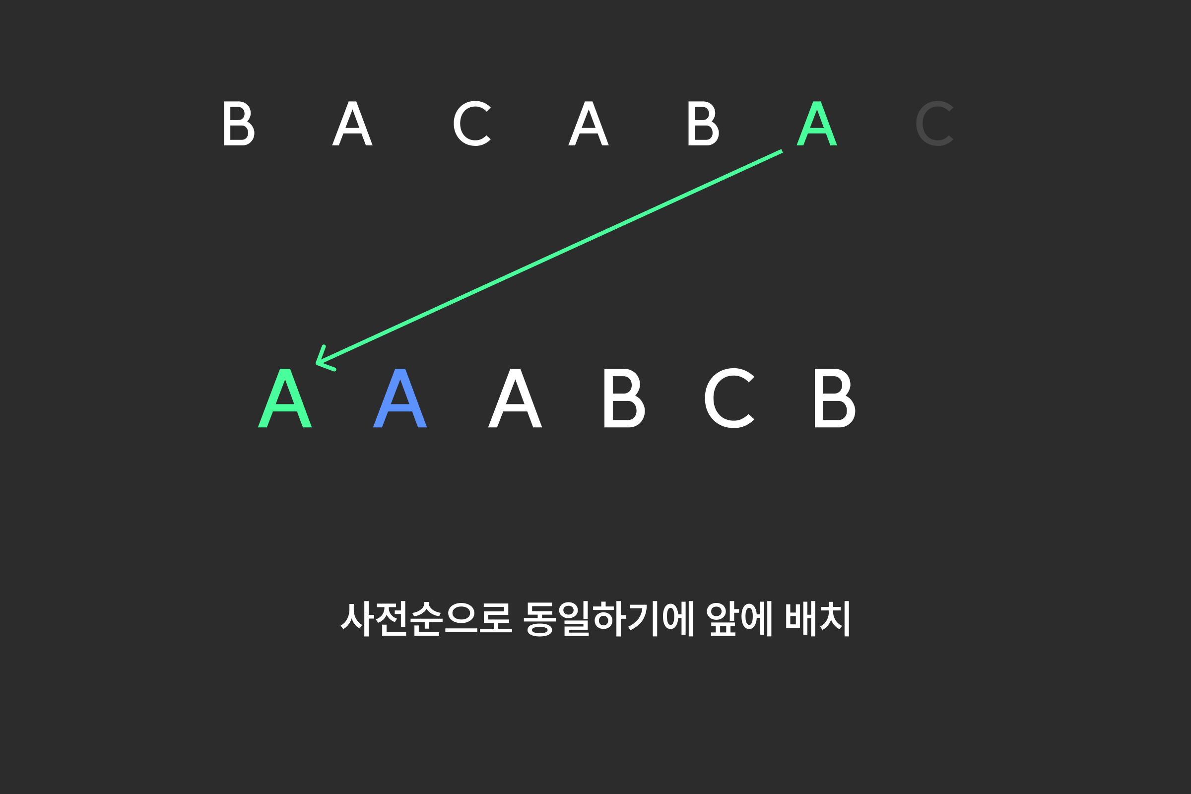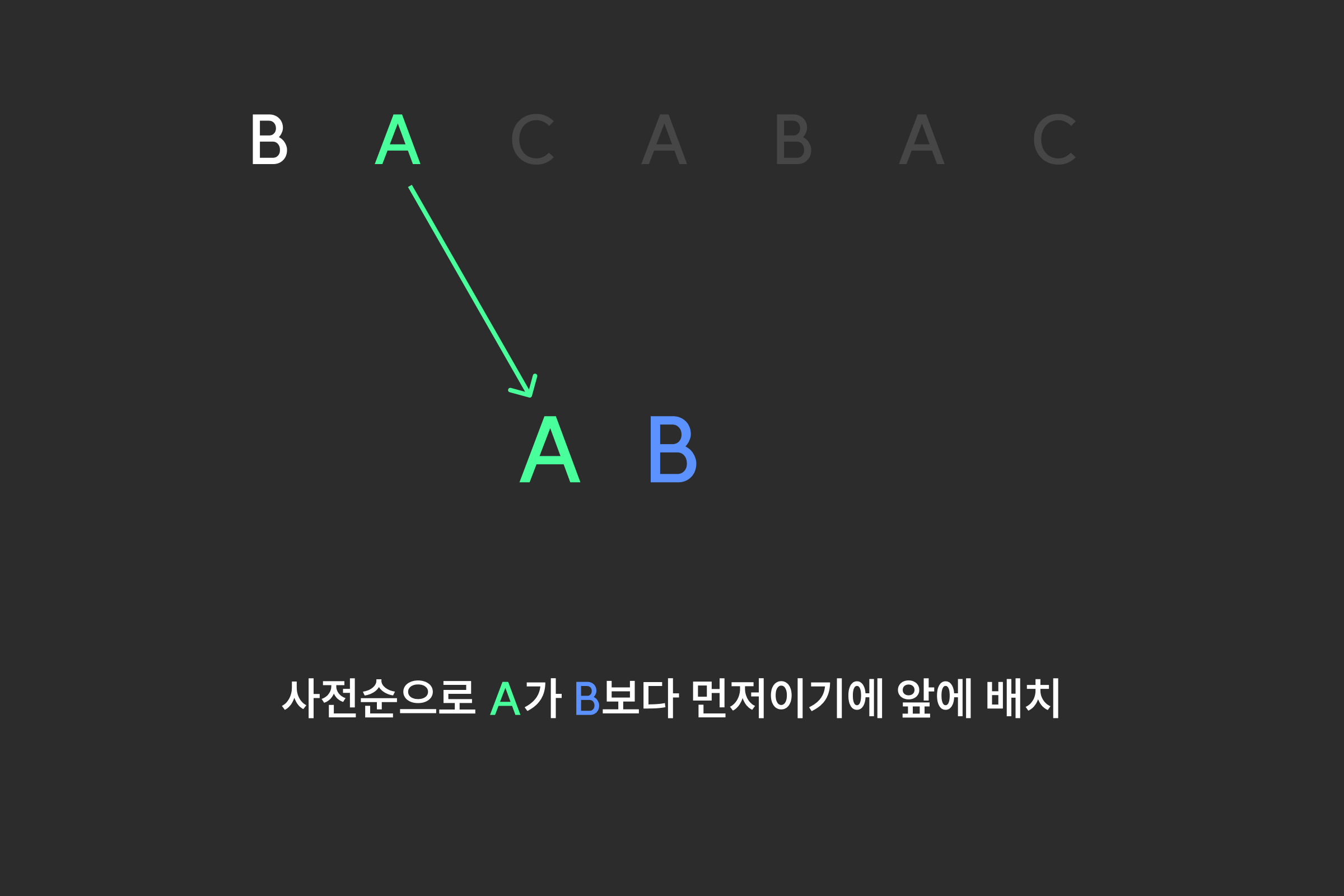 우선 가장 먼저 들어온 B를 문자열의 맨 앞으로 설정을 해준다.