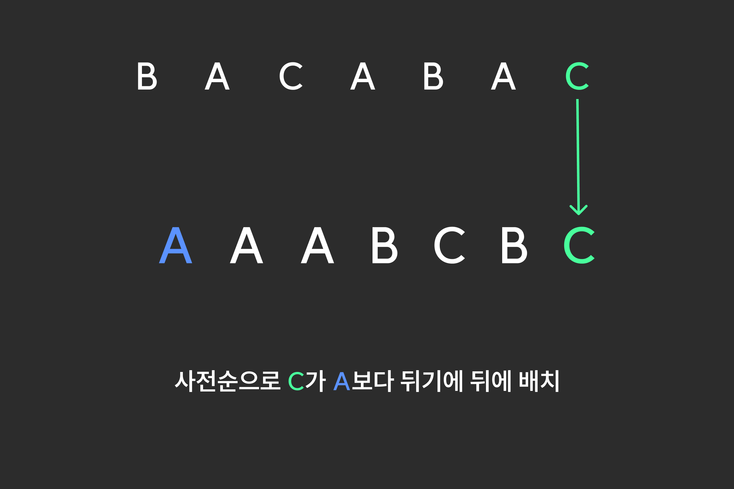 이후에는 사진과 같이 문자열의 가장 앞과 비교하며 배치를 해주면 된다. ▼