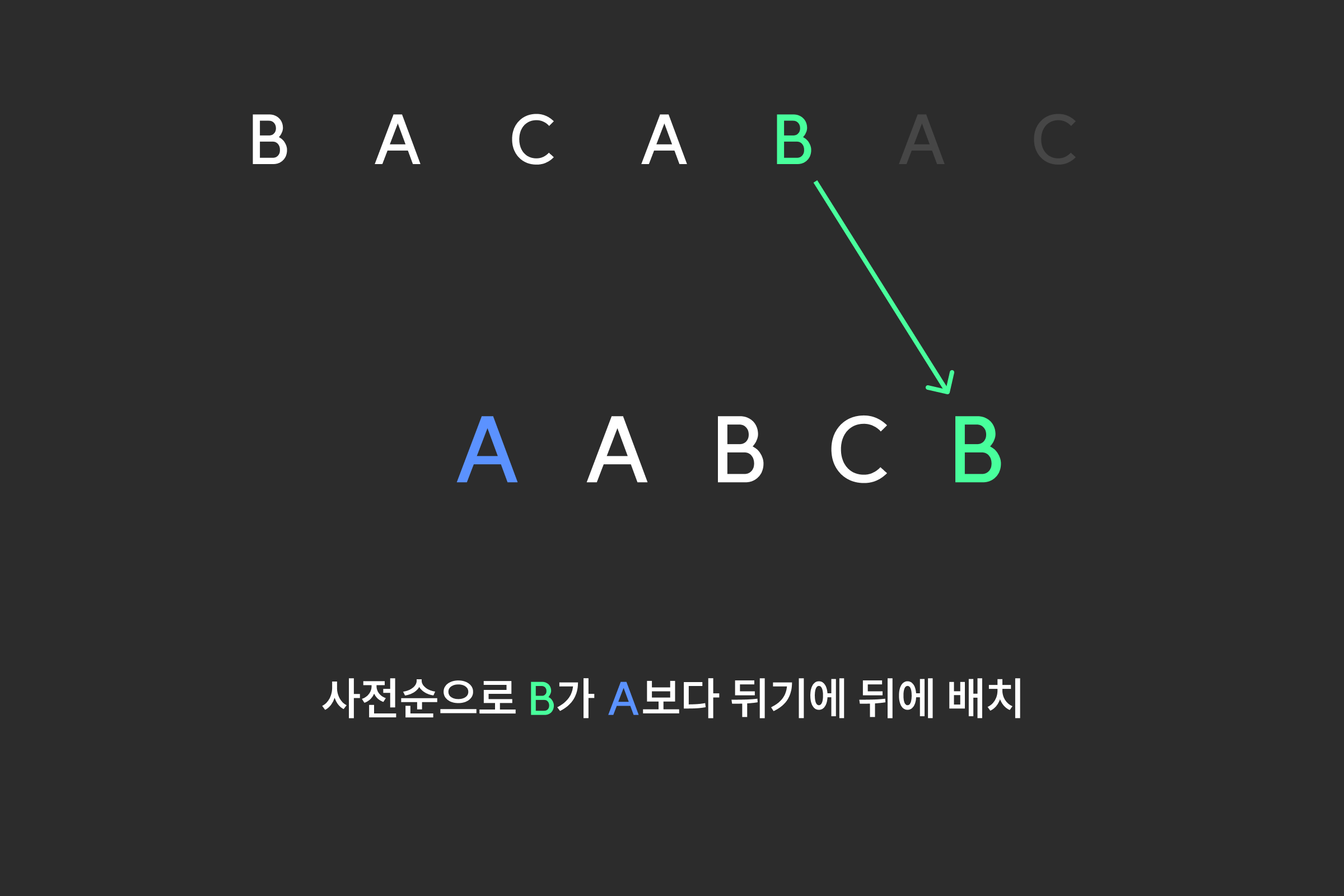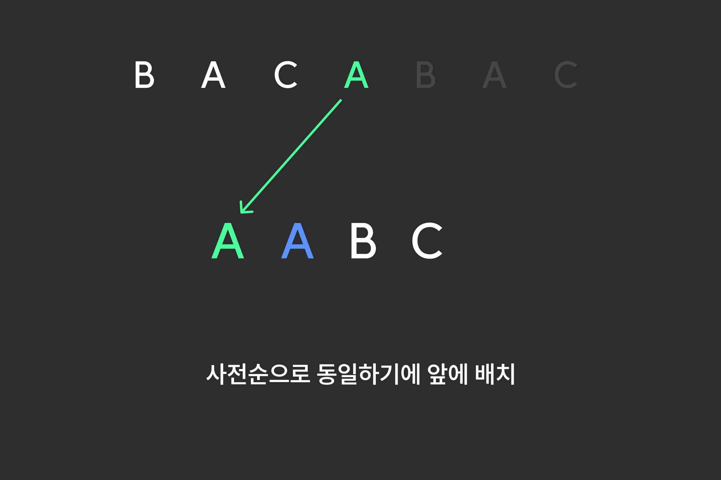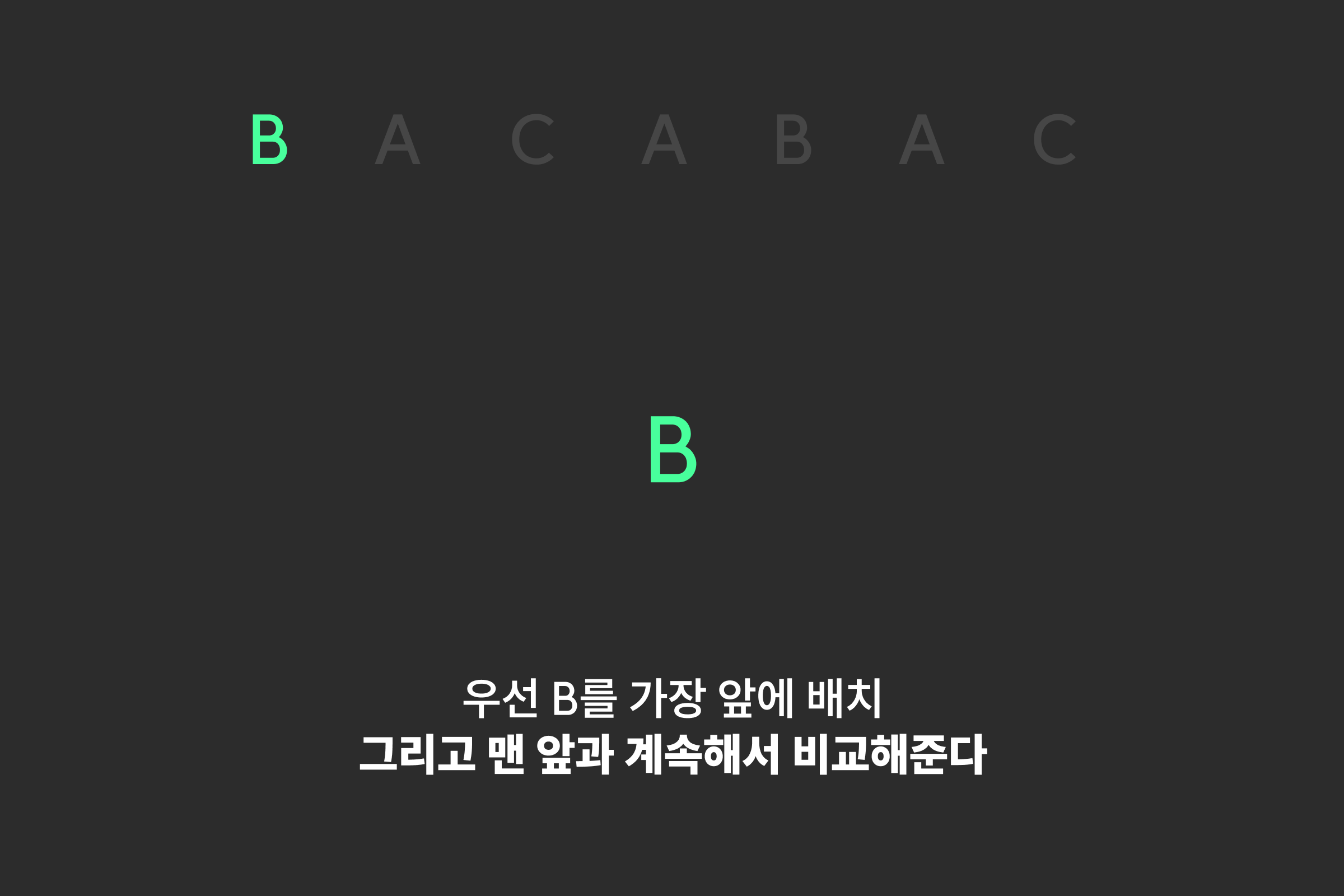 우선 가장 먼저 들어온 B를 문자열의 맨 앞으로 설정을 해준다.