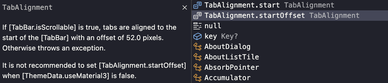 원인은 `TabAlignment`에 있다. 사진의 설명에 나와있듯, 만약 TabBar의 `isScrollable`이 `true`가 되면 TabBar는 기본적으로 52pixel의 offset을 갖게 된다.