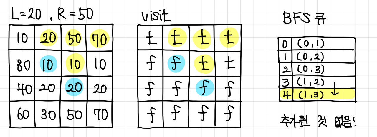 4방향에 있는 값이 조건에 맞지 않아서 BFS큐에 들어가지 못한다면, BFS큐의 값이 부족해서 종료된다.