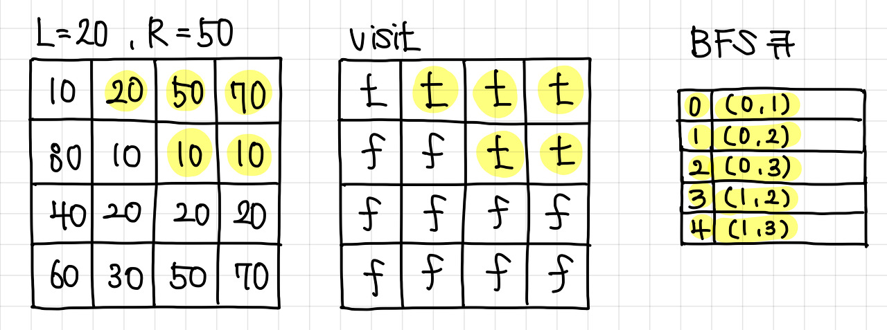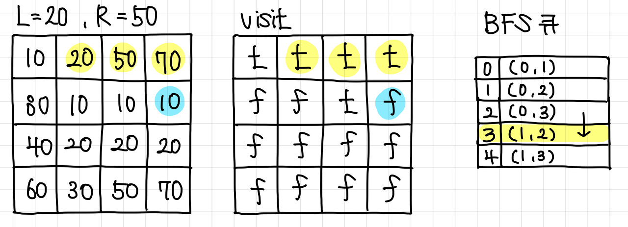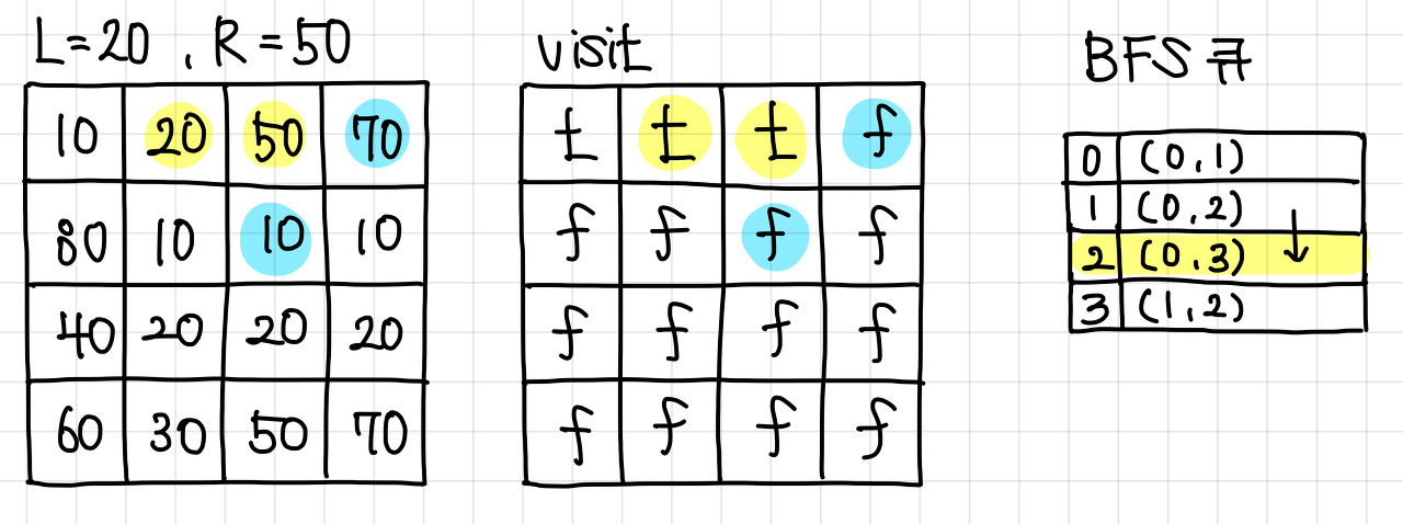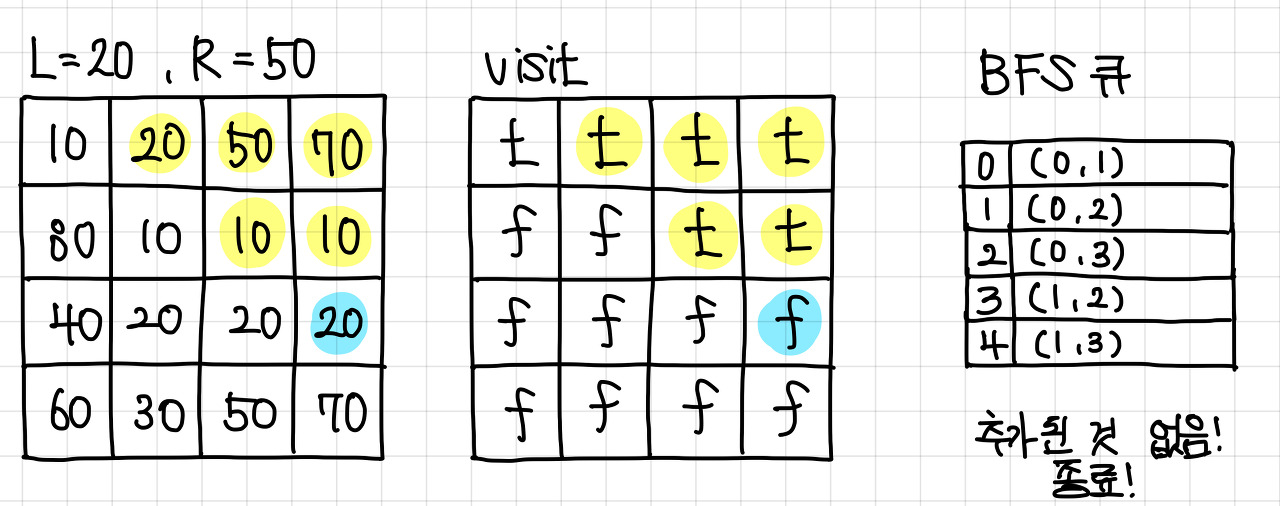 3. 4방향에 있는 값과 현재 값의 차가 조건에 맞는다면 BFS큐에 좌표를 넣어준다.