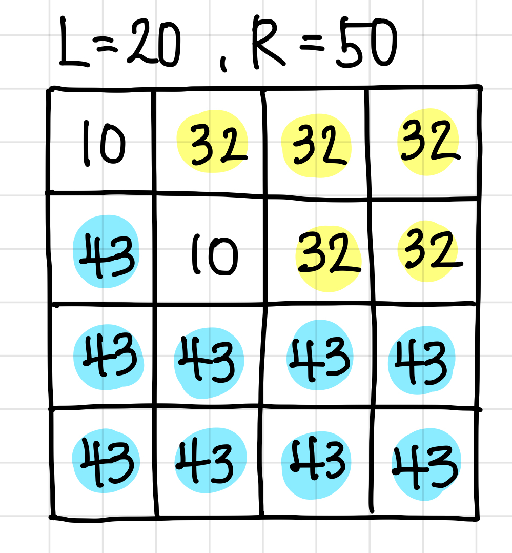 첫째 줄에 N, L, R이 주어진다. (1 ≤ N ≤ 50, 1 ≤ L ≤ R ≤ 100)