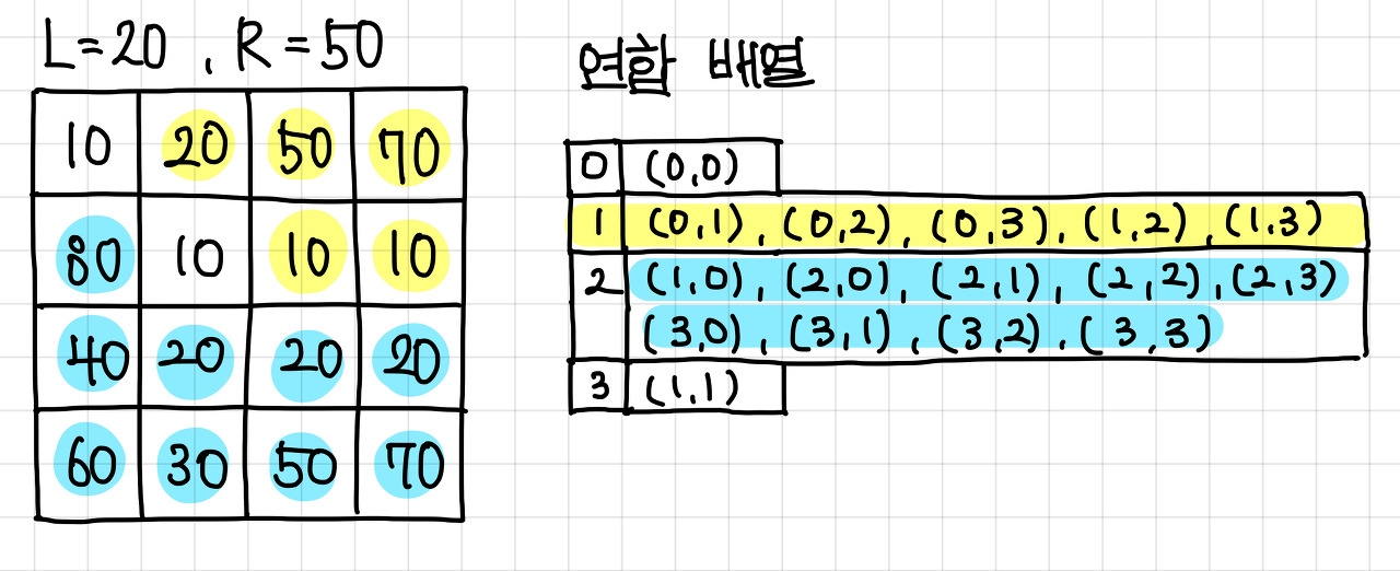 - 국경선을 공유하는 두 나라의 인구 차이가 L명 이상, R명 이하라면, 두 나라가 공유하는 국경선을 오늘 하루 동안 연다.
