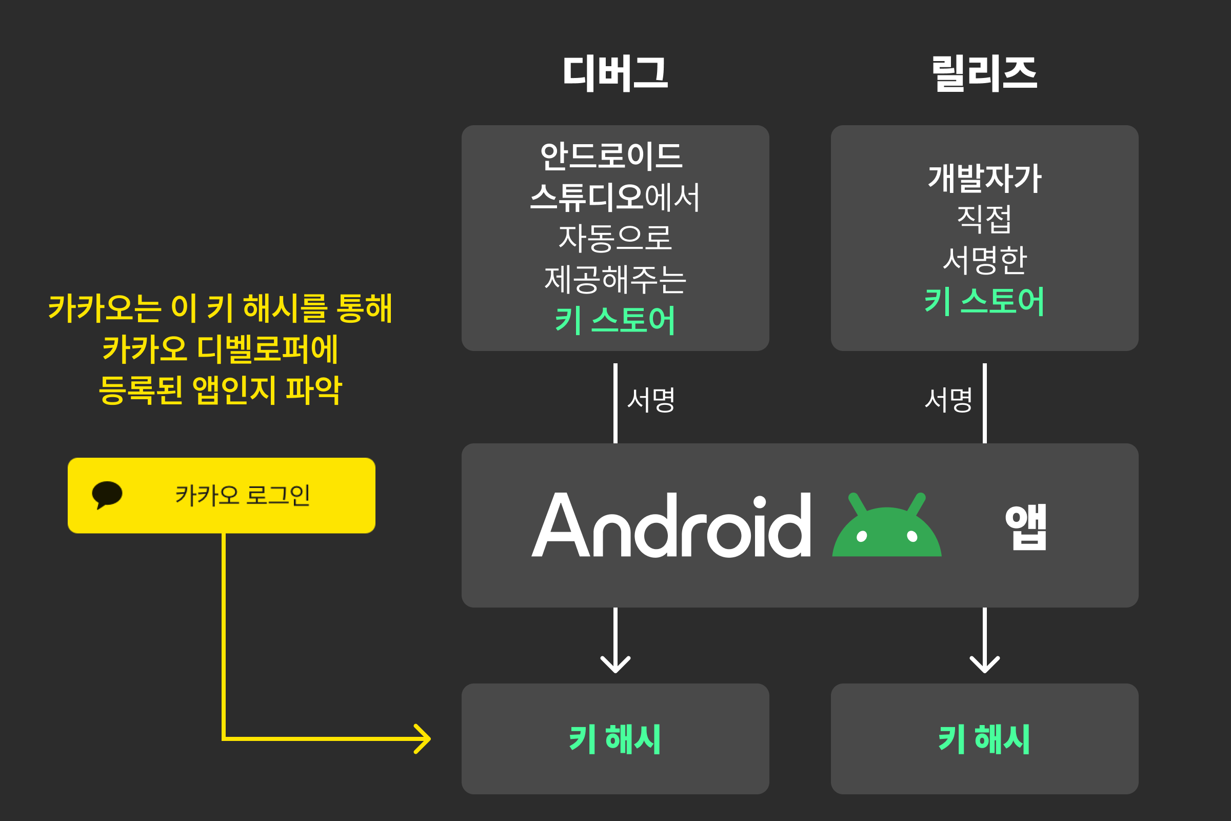 조금 더 정확히 말하자면, 디버그 앱은 안드로이드 스튜디오에서 자동으로 서명해준 키 스토어로 서명되어있다. 그에 반해 구글 플레이에 등록되는 앱은 개발자가 직접 생성한 키 스토어로 서명된다. 그리고 카카오는 각각의 키 스토어의 해시를 통해 해당 앱이 카카오 서비스에 등록된 앱인지를 확인하고 로그인 기능을 사용 가능하게 해준다. ▼