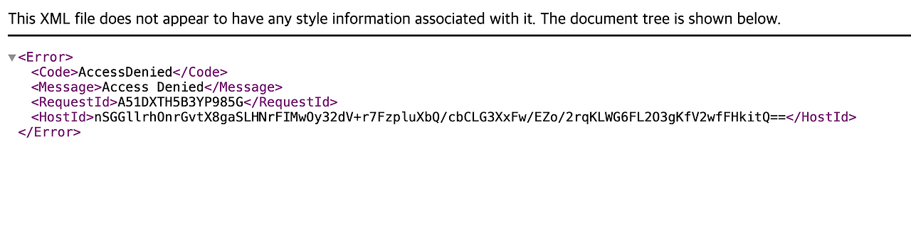 하지만 url에 직접 접속해서 보려고 하면 이런 오류가 나왔다. '백엔드에서 접근을 막아서 그런게 아닌가?' 라고 할 수 있지만, 해당 사진의 경우 다른 플랫폼들에서도 접근을 해야했기에 별도의 접근 제한 설정은 걸려있지 않았다. ▼