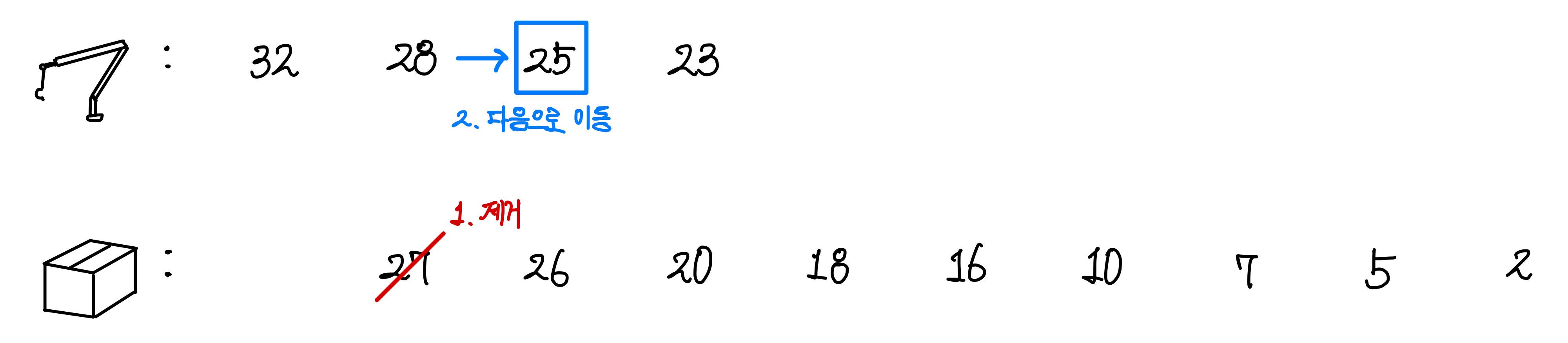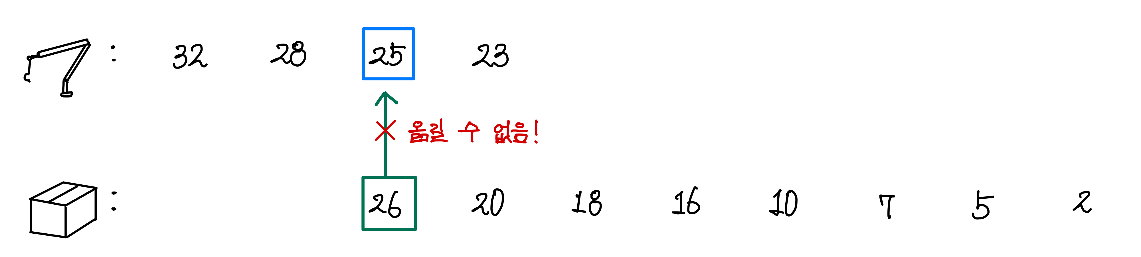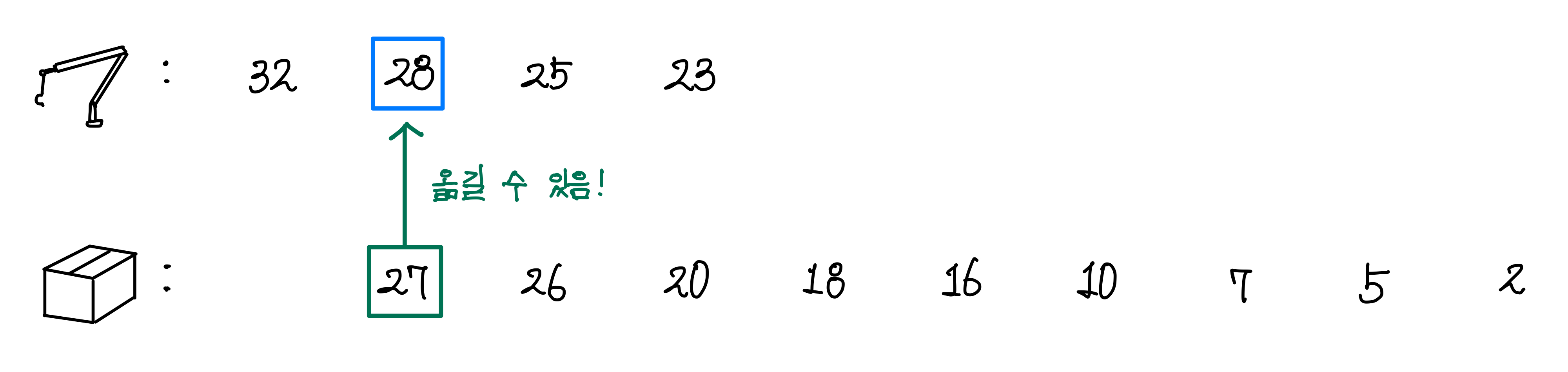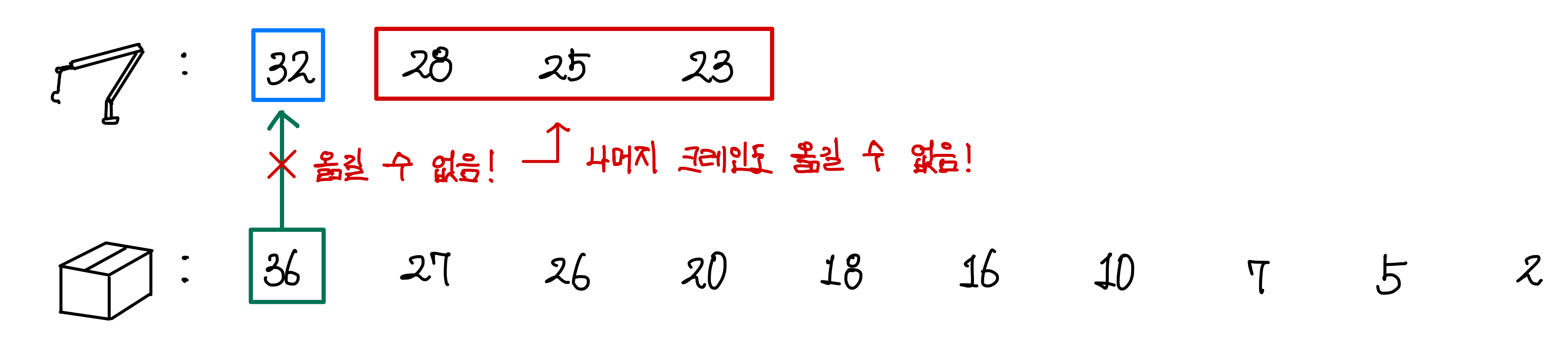 가장 처음 크레인은 가장 많은 무게를 들 수 있고, 가장 처음 박스는 가장 무게가 큰데 가장 많은 무게를 들 수 있는 크레인이 이를 옮기지 못한다는 것은 다른 크레인들도 이를 옮길 수 없다는 의미이므로 박스를 다 옮기는 것은 불가능해진다. ▼