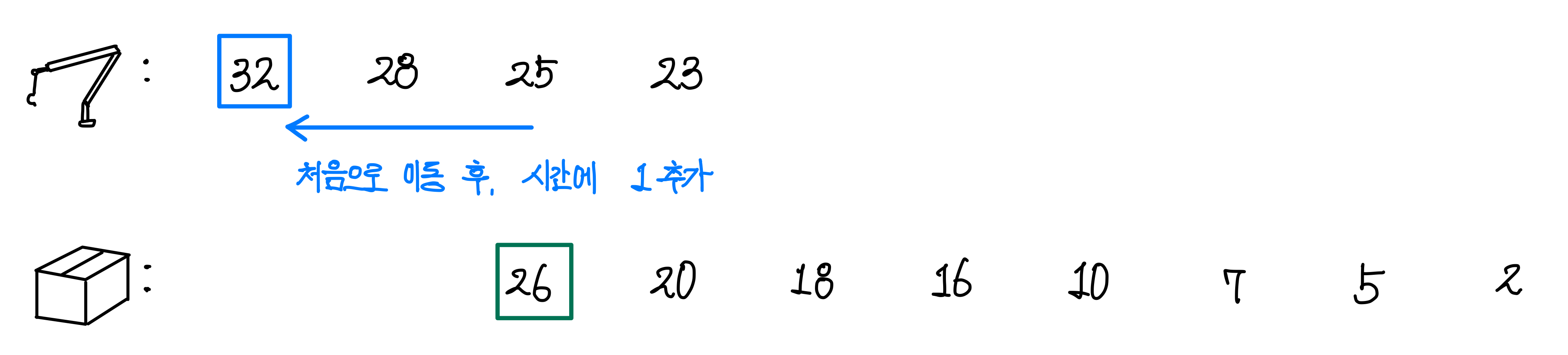 이렇게 처음으로 이동했다는 것은 최대한 많은 크레인들에게 할당했고, 더 이상 할당할 수 없다는 의미이므로 시간에 1을 추가해준다. ▼