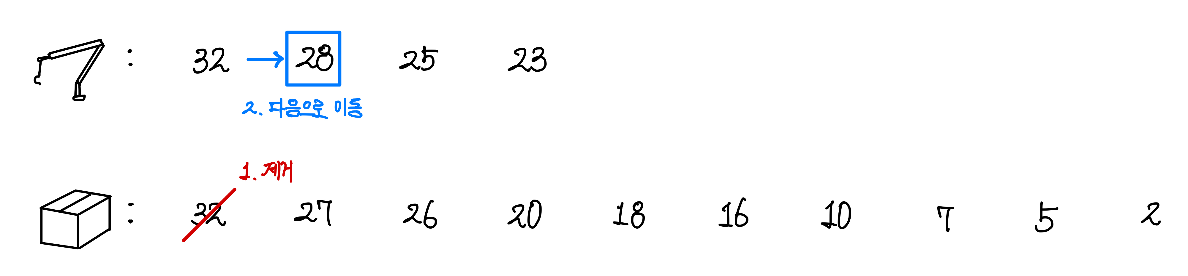 옮길 수 있다고 판단이 들면, 해당 박스를 제거하고 다음 크레인으로 옮긴다. ▼