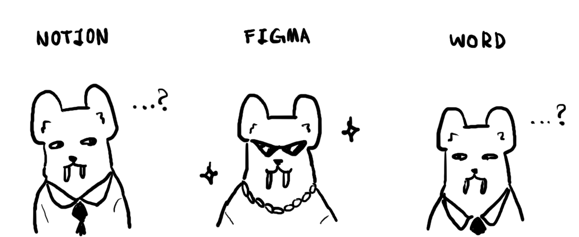 각각의 주장이 너무나 타당해서 마음이 이랬다 저랬다 갈대마냥 흔들렸다. 하지만 동시에 반대 의견도 만만치 않았다. "노션은 너무 가벼워 보인다", "워드는 촌스럽다", "피그마는 배보다 배꼽이 더 크다" 등등. 그래서 이번 기회에 소위 잘나가는 곳에 합격한 지인들의 조언과 나의 경험을 바탕으로, 각 툴의 장단점과 사용해야 할 이유(혹은 말아야 할 이유)를 정리해 보았다.