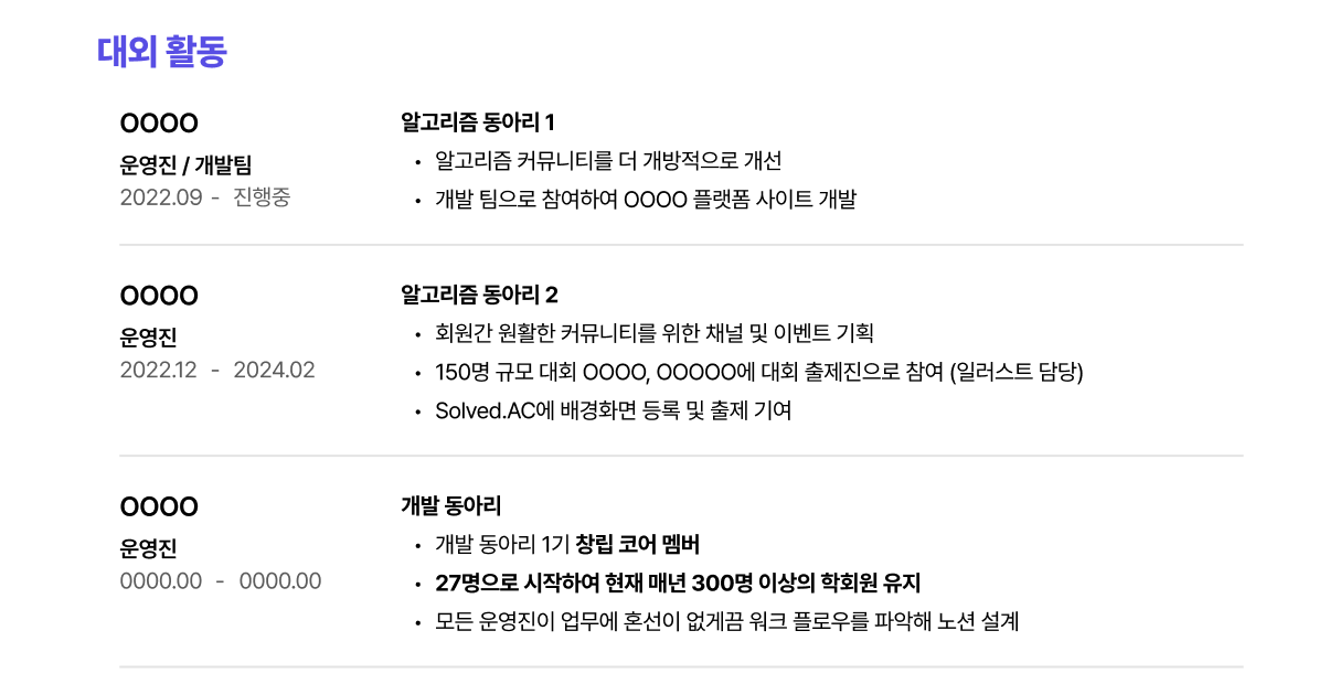 처음 작성한 이력서를 보면 'OO 스터디', '테크 블로그 운영', '알고리즘 동아리1', '알고리즘 동아리2', '개발 동아리' 등 굵직한 활동과 사소한 활동이 뒤섞여 있었다.