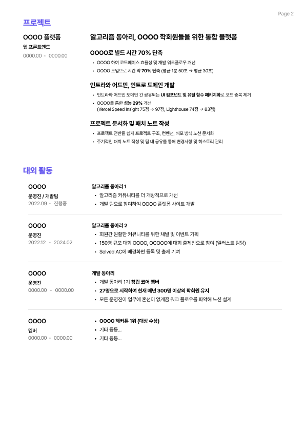 피드백을 수용하여 '단순 참여' 수준의 활동(스터디 등)은 과감히 삭제했다. 대신 내가 주도적으로 리딩했거나 변화를 만들어낸 활동에 집중해서 살을 붙였다. ▼