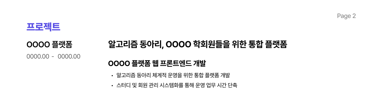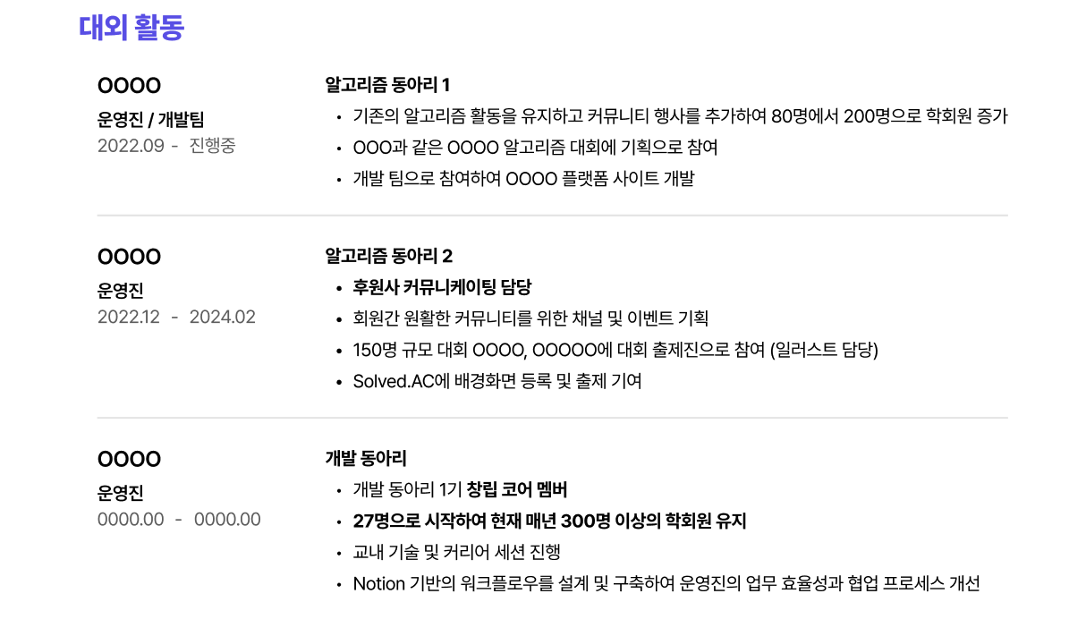 단순히 열심히 운영했다가 아니라, 80명 → 200명 성장, 워크플로우 시스템 구축과 같이 조직에 기여한 성과를 숫자로 명시했다. 읽는 사람에게 '이 사람은 조직을 성장시킬 줄 아는 사람이구나'라는 인상은 훨씬 강하게 남길 수 있었다.