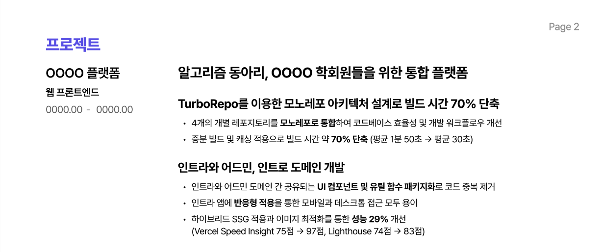 - 모호한 설명: "알고리즘 커뮤니티를 더 개방적으로 개선" 같은 문장은 구체적으로 뭘 했는지 알 수가 없다.