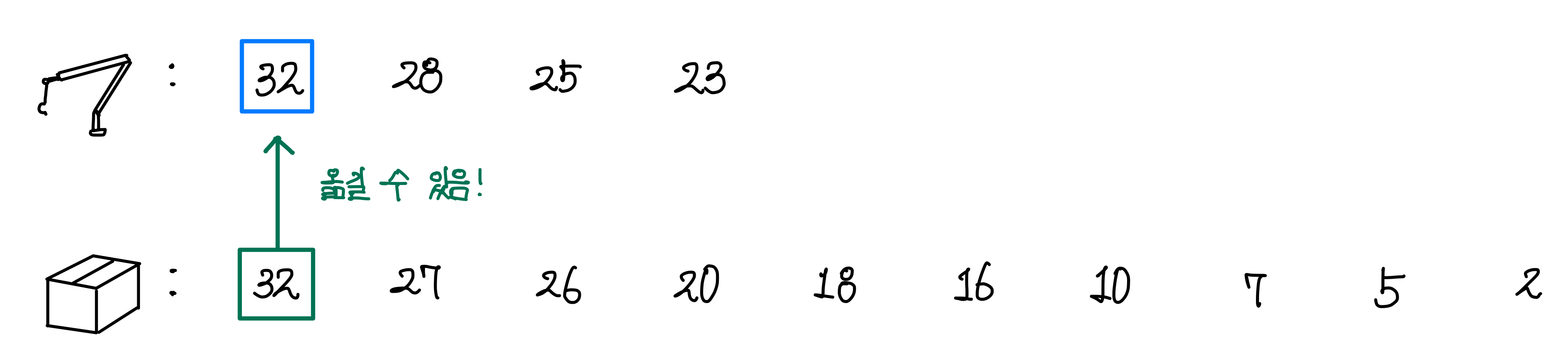 가장 처음 크레인은 가장 많은 무게를 들 수 있고, 가장 처음 박스는 가장 무게가 큰데 가장 많은 무게를 들 수 있는 크레인이 이를 옮기지 못한다는 것은 다른 크레인들도 이를 옮길 수 없다는 의미이므로 박스를 다 옮기는 것은 불가능해진다. ▼