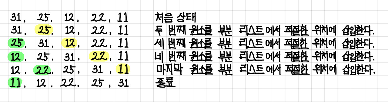 31, 25, 12, 22, 11 이라는 숫자를 삽입 정렬 방식으로 정렬한다고 하면 아래와 같은 과정으로 진행된다.▼