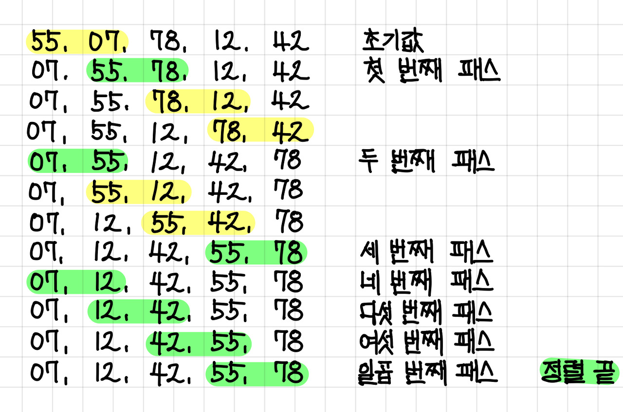 55, 07, 78, 12, 42라는 숫자를 거품 정렬 방식으로 정렬한다고 하면 아래와 같은 과정으로 진행된다.▼