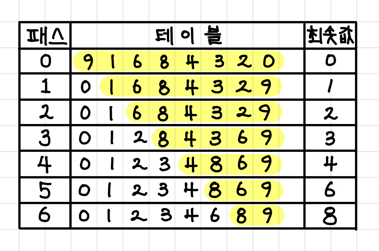 9, 1, 6, 8, 4, 3, 2, 0라는 숫자를 선택 정렬 방식으로 정렬한다고 하면 아래와 같은 과정으로 진행된다.▼