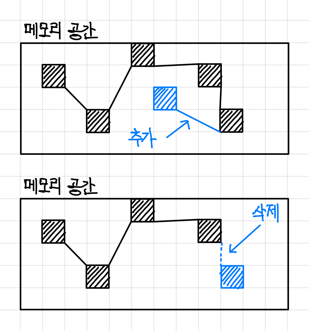 메모리 공간에 랜덤하게 배치되고, 이들이 서로 연결되는 방식이다.▼