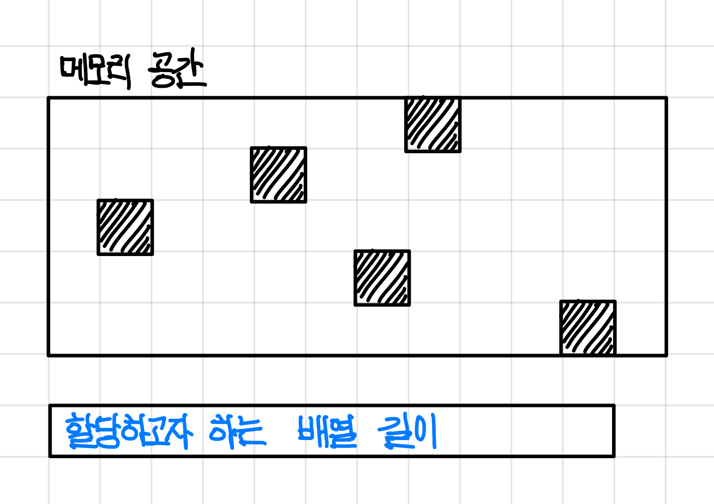 하지만 엄청나게 긴 배열을 선언할 때, 메모리가 아래와 같은 상황이라면 문제가 발생할 수 있다.▼