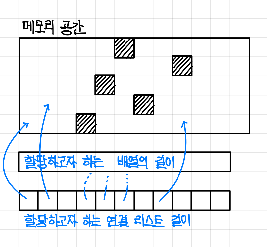 그런데 만약에 메모리 공간에 연속적으로 나열할 수 없는 상황이라면 어떨까?