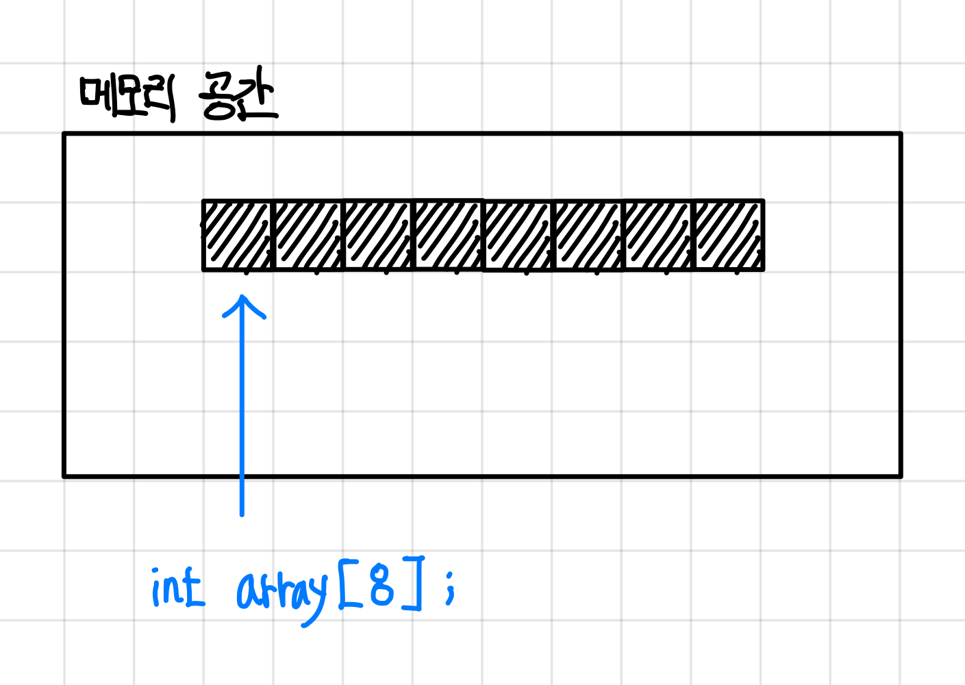 배열은 위에서 말한대로 동일한 크기의 메모리 공간이 빈틈없이 연속적으로 나열된 자료구조로서 메모리를 아래와 같은 형태로 차지하게 된다.▼
