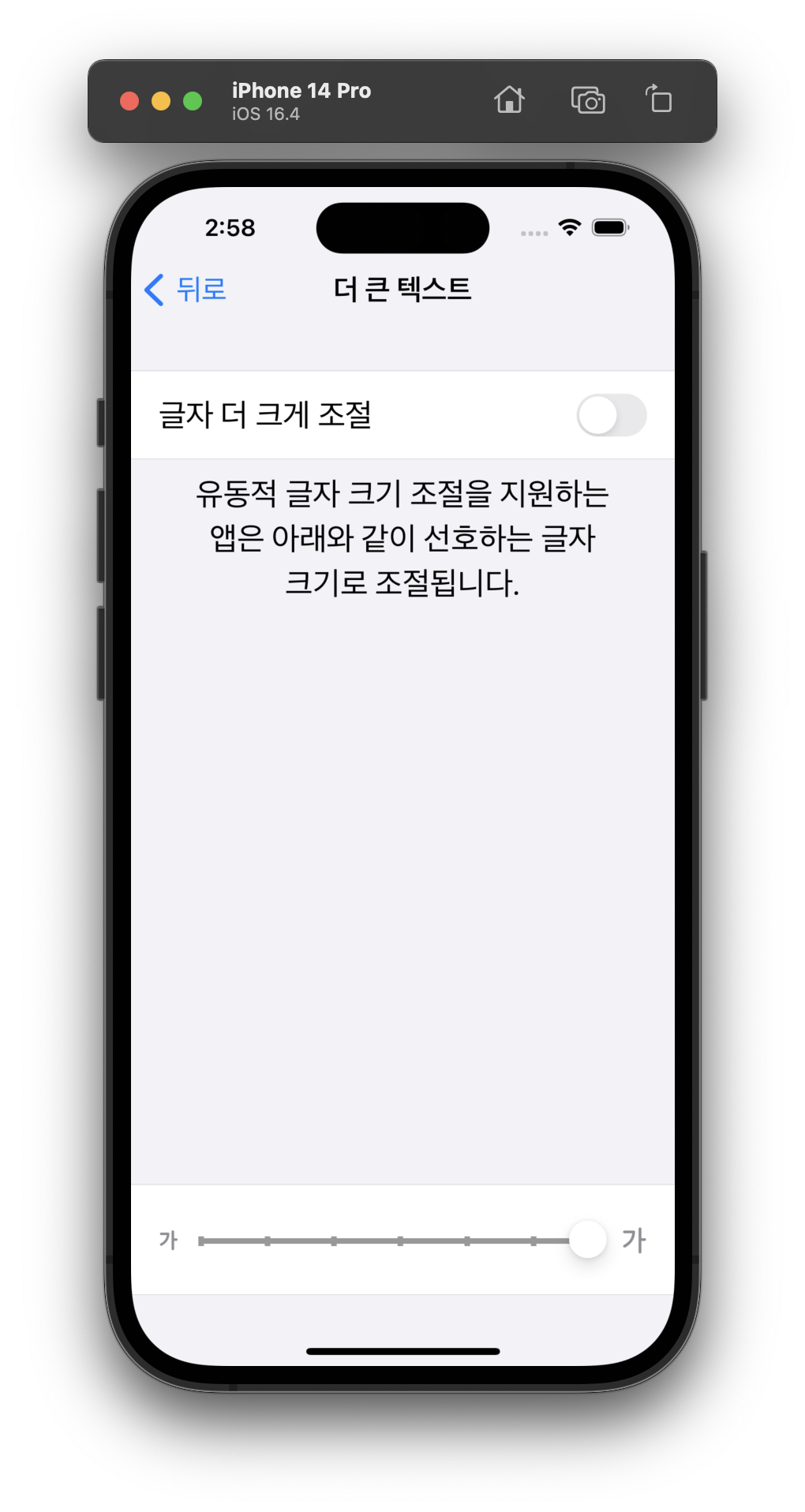 iOS 앱이 동적 글꼴 크기 조정을 지원하는 경우 사용자는 앱에서 사용되는 글꼴 크기를 변경할 수 있다.