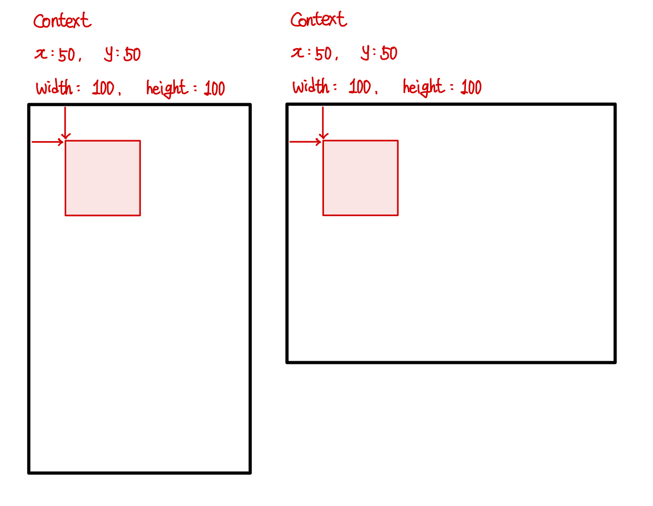 너비와 높이가 100인 사각형을 x와 y 각각 50인 좌표에 그린다고 했을 때, 세로로 긴 좌표계와 가로로 긴 좌표계에서 보여주는 모습은 같아도 비율은 달라지게 된다. ▼