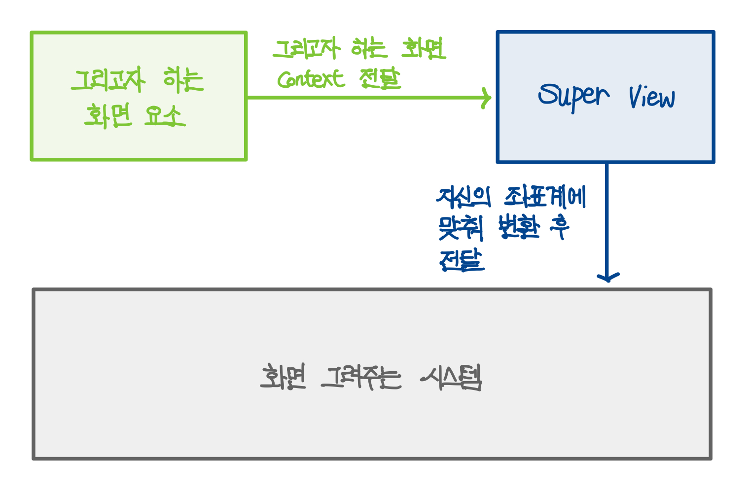 상위 뷰는 이 컨텍스트를 활용하여 자신의 좌표계에 따라 정확히 어디에 어떤 크기로 표시해야 하는지 시스템에게 알려주어 화면에 표시한다. ▼