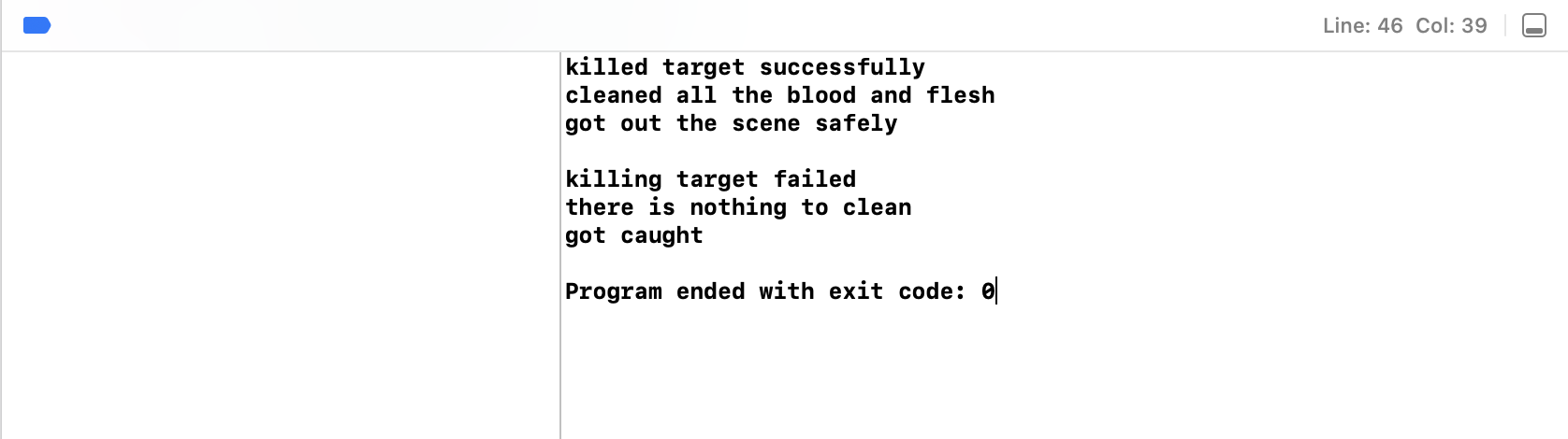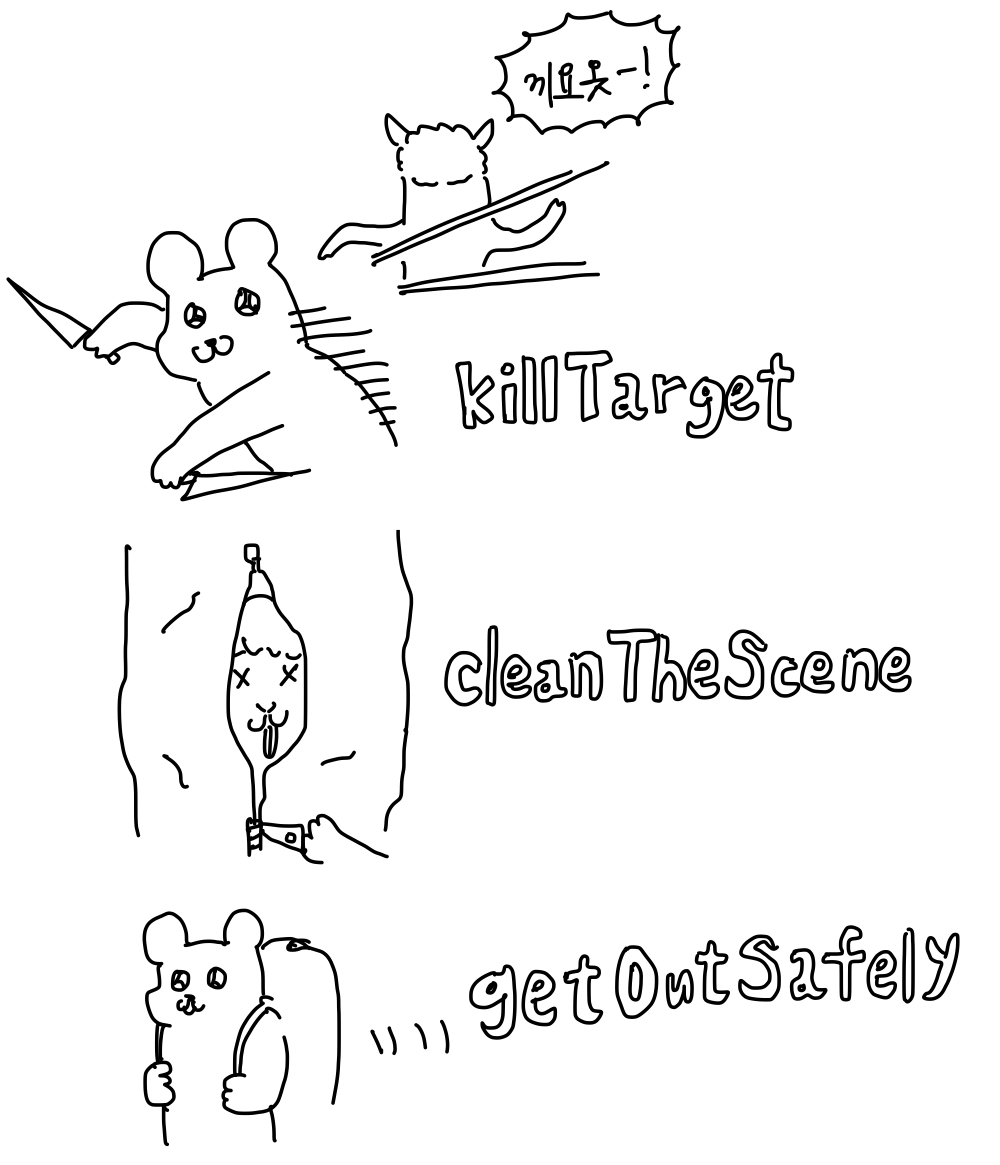 이후 두 암살자는 프로토콜로 제시된 `Assassination`을 받아 `killTarget`, `cleanTheScene`, `getOutSafely`를 정의하고, 정의된 함수들을 바탕으로 `Assassin`의 `assassinateTarget`을 수행하게 한다.