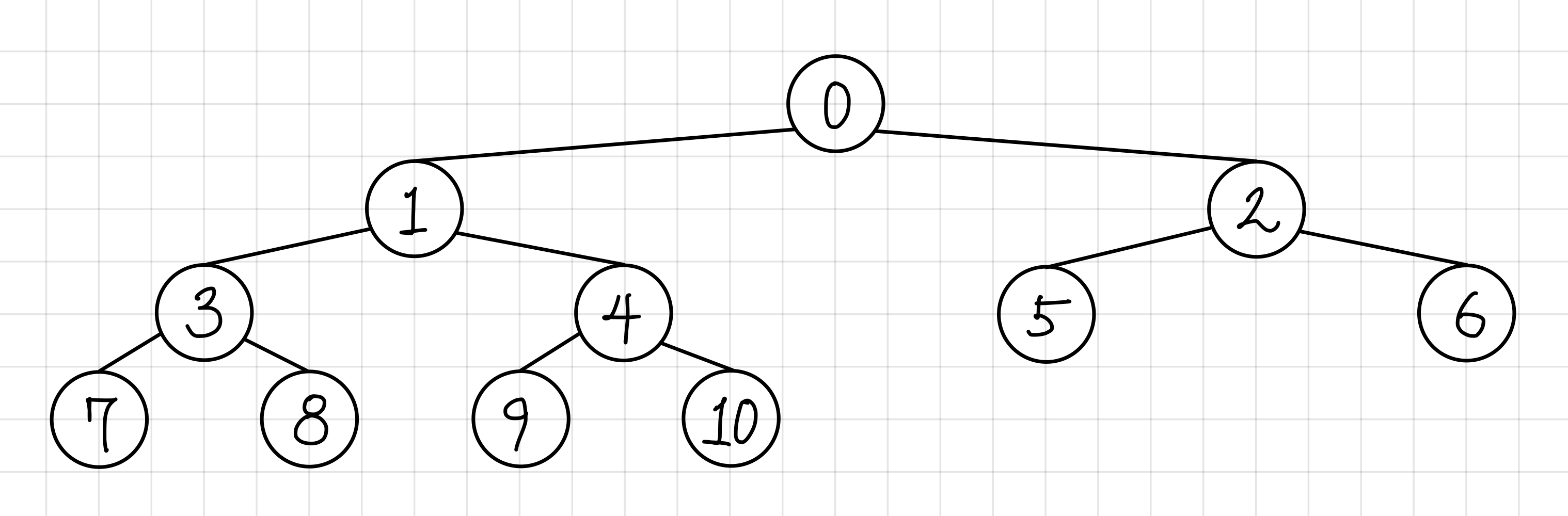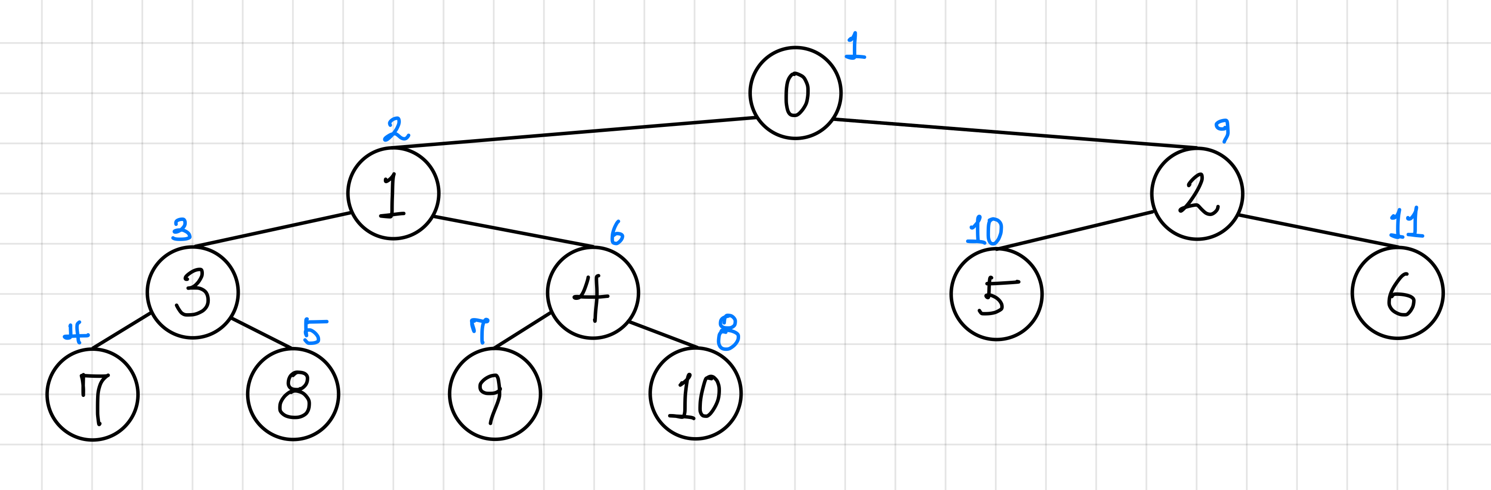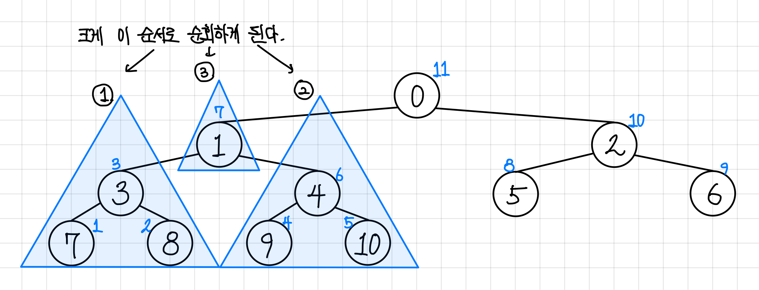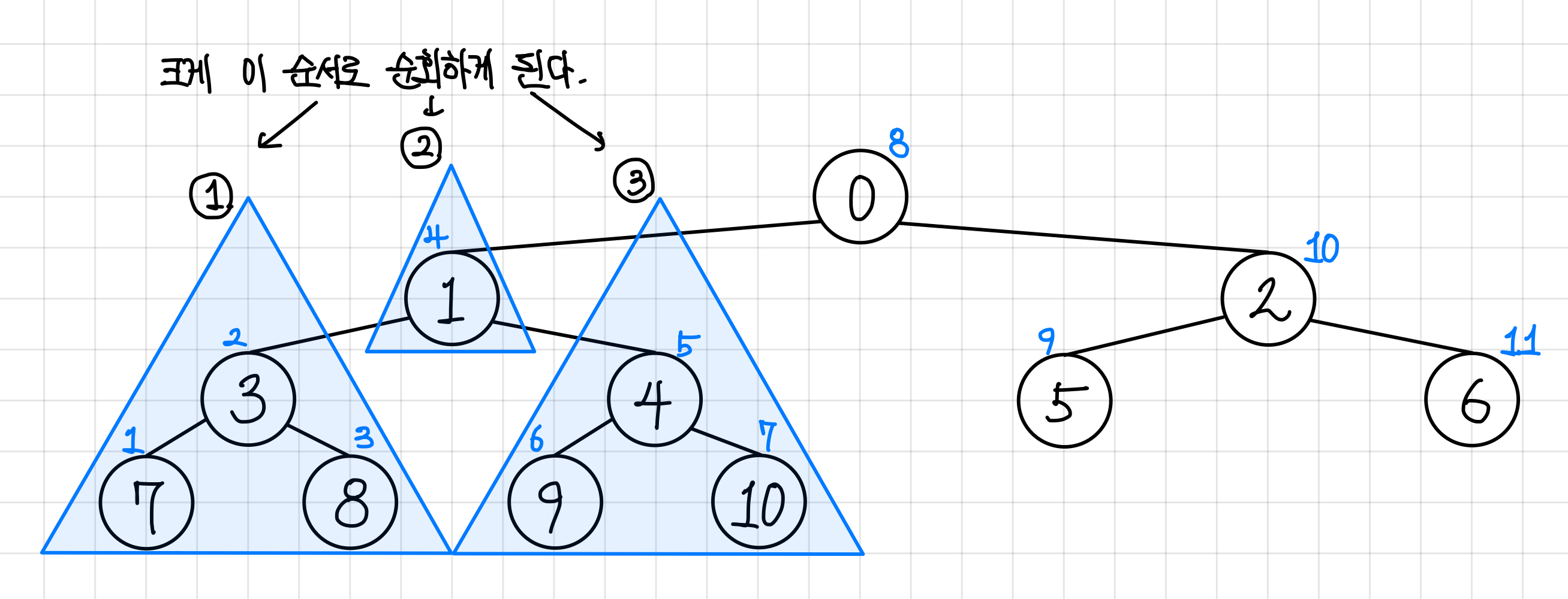 0, 1, 3, 7, 8, 4, 9, 10, 2, 5, 6 의 순서로 순회하게 된다.▼