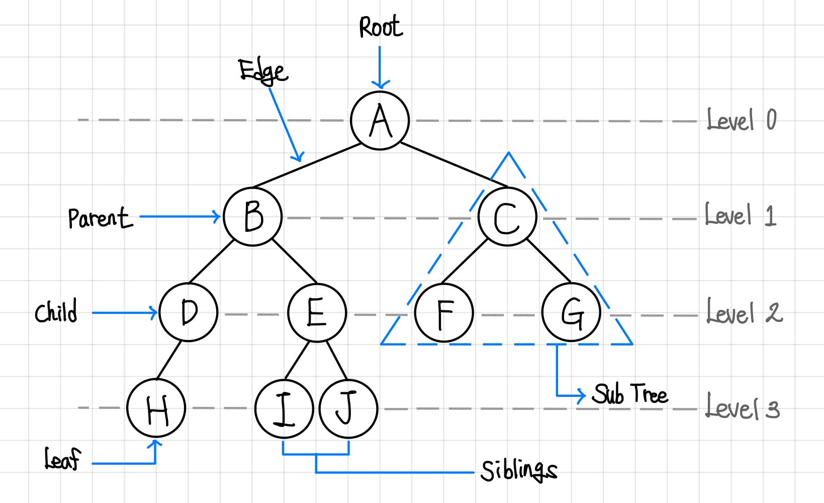 B, C, D, E, F, G, H, I, J 가 해당된다. - 형제 노드(Sibling Node)